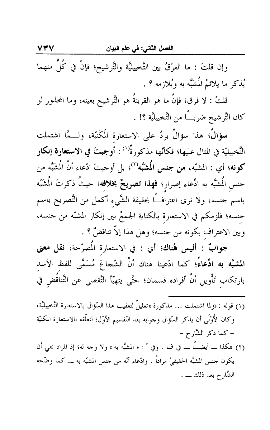 (¬2) هكذا -أيضًا- في ف. وفي أ: "المشبَّه به" ولا وجه له؛ إذ المراد نفي أن يكون جنس المشبَّه الحقيقيّ مرادًا. وادعاء أنّه من جنس المشبّه به -كما وضّحه الشَّارح بعد ذلك-.