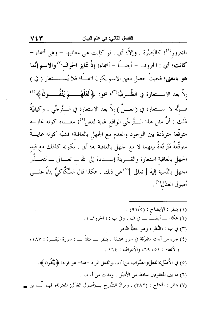 بالمجرورِ (¬1)؛ كالبَصرة. وإلّا؛ أي: لو كانت هي معانيها -وهي أسماء- كانت؛ أي: الحروف -أَيضًا- أسماء؛ إذْ تمايز الحرفِ (¬2) والاسم إنَّما هو بالمعنى، فحيثُ حصل معنى الاسم يكون اسمًا؛ فلا يُستعار (في) إلا بعد الاستعارة في الظرفيَّة (¬3)، نحو: {لَعلهُم يَتَّقُونَ} (¬4) فإِنَّه لا استعارة في (لعلَّ) إِلَّا بعد الاستعارة في التَّرجِّي. وكيفيّةُ ذَلك: أن مثل هذا التَّرجِّي الواقع غاية لفعل (¬5)؛ معناه كونه غاية متوقّعة متردّدة بين الوجود والعدم مع الجهلِ بالعاقبة، فشبّه كونه غايةً متوقّعةً مُتَردّدةً بينهما لا مع الجهل بالعاقبة به؛ أي: بَكونه كذلك مع قيدِ الجهلِ بالعاقبةِ استعارة والقرينةُ إسنادهُ إلى الله -تعالى- لتعذُّر الجهل بالنِّسبة إليه [تعالى] (¬6) عن ذلك. هكذا قال السَّكاكيُّ بناءً على أصول العدلِ (¬7).