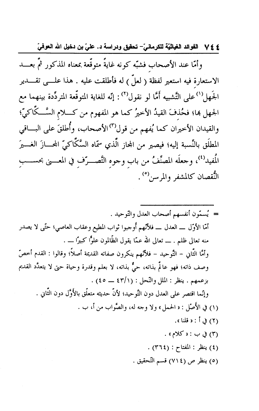 وأمّا عند الأصحابِ فشبّه كونه غاية متوقّعة بمعناه المذكور ثم بعد الاستعارةِ فيه استعير لفظة (لعلّ) له فأطلقت عليه. هذا على تقدير الجَهل (¬1) على التَّشبيه أَمَّا لو نقول (¬2): إنّه للغاية المتوقّعة المتردِّدة بينهما مع الجهل بها؛ فحُذِفَ القيدُ الأخيرُ كما هو المفهوم من كلامِ السَّكاكيّ؛ والقيدان الأخيران كما يُفهم من قول (¬3) الأصحاب، وأُطلقَ على الباقي المطلَق بالنِّسبة إليه؛ فيصير من المجاز الذي سمّاه السَّكاكيّ المجازَ الغيرَ المُفيد (¬4)، وجعلَه المصنِّفُ من بابِ وجوهِ التَّصرّفِ في المعنى بحسبِ النُّقصان كالمشفر والمرسن (¬5).