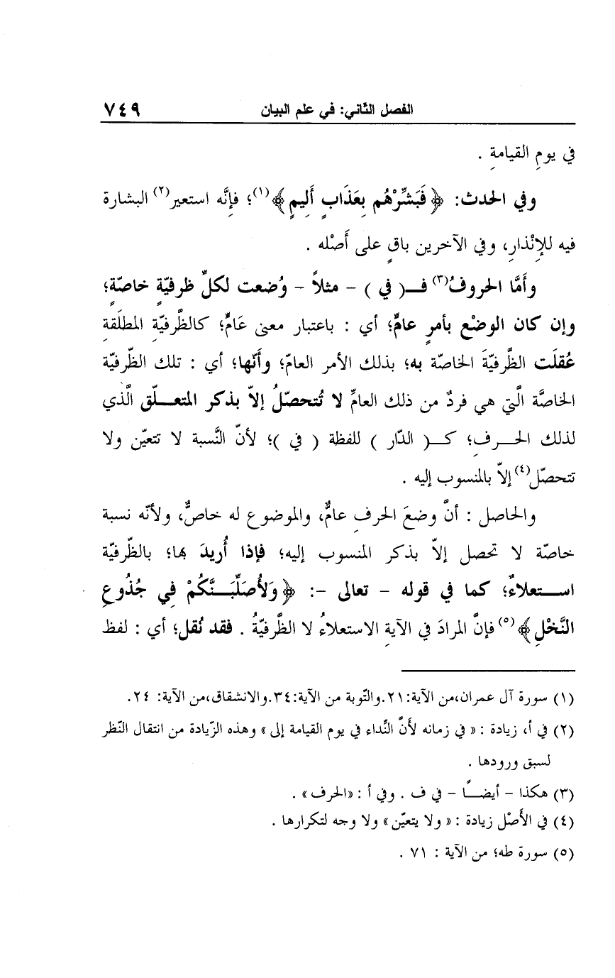 والحاصل: أن وضعَ الحرفِ عامٌّ، والموضوع له خاصٌّ، ولأنّه نسبة خاصّة لا تحصل إلّا بذكر المنسوب إليه؛ فإذا أُريدَ بها؛ بالظّرفيّة استعلاءٌ؛ كما في قوله -تعالى-: {وَلأصَلِّبَنكم فِي جُذُوع النَّخْلِ} (¬5) فإن المرادَ في الآيةِ الاستعلاءُ لا الظرفيّةُ. فقد نقل؛ أي: لفظ