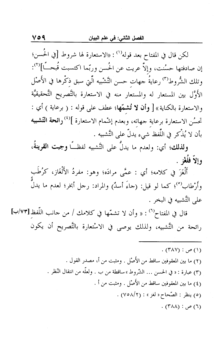 لكن قال في المفتاح بعد قوله (¬1): "الاستعارة لها شروط [في الحُسن؛ إن صادفتها حسُنت، وإِلا عريت عن الحُسن وربّما اكتسبت قُبحًا] (¬2): وتلك الشُّروط (¬3) رعايةُ جهاتِ حسن التَّشْبيه التي سبق ذِكْرها في الأَصْل الأَوَّل بين المستعار له والمستعار منه في الاستعارة بالتَّصريح التَّحقيقيَّة والاستعارة بالكناية" [وأن لا تُشِمّها؛ عطف على قوله: (برعاية) أي: تحسُن الاستعارة برعايةِ جهاتِه، وبعدم إشْمام الاستعارة] (¬4) رائحة التّشبيه بأن لا يُذْكر في اللفظ شيء يدلّ على التَّشبيه.