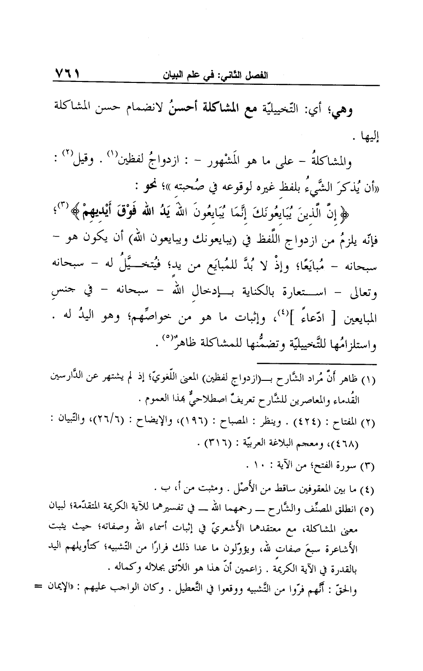 {إِنَّ الَّذِينَ يُبَايِعُونَكَ إِنَّمَا يُبَايِعُونَ اللَّهَ يَدُ اللَّهِ فَوْقَ أَيْدِيهِمْ} (¬3)؛ فإنّه يلزمُ من ازدواج الففظ في (يبايعونك ويبايعون الله) أن يكون هو -سبحانه- مُبايَعًا؛ وإذْ لا بُدَّ للمُبايَع من يدٍ؛ فيُتخيَّلُ له -سبحانه وتعالى- استعارة بالكناية بإدخالِ الله -سبحانه- في جنسِ المبايعين [ادّعاءً] (¬4)، وإثبات ما هو من خواصِّهم؛ وهو اليدُ له.