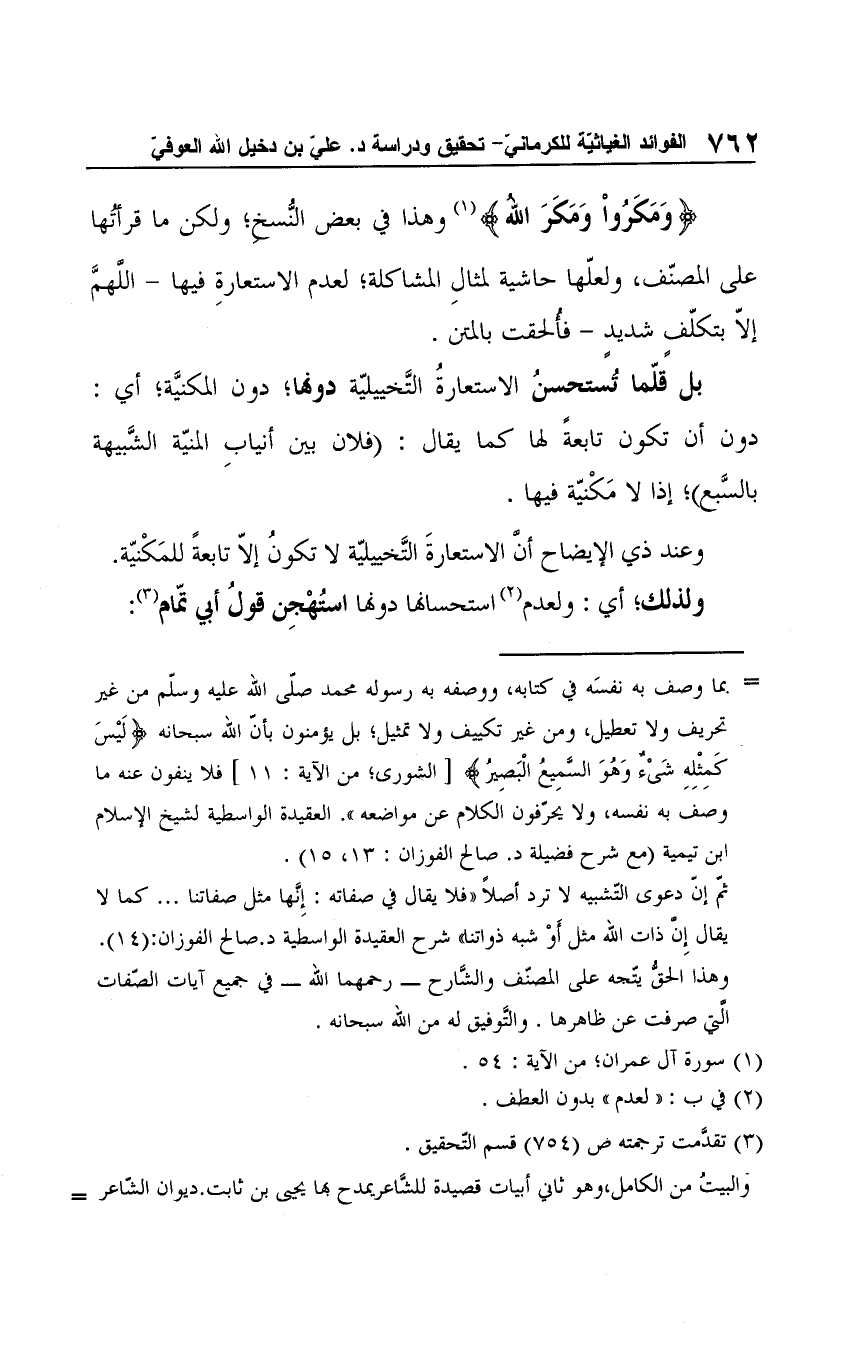 ثم إن دعوى التشبيه لا ترد أصلًا "فلا يقال في صفاته: إِنها مثل صفاتها .. كما لا يقال إِن ذات الله مثل أوْ شبه ذواتنا" شرح العقيدة الواسطية د. صالح الفوزان: (14). وهذا الحقُّ يتجه على المصنّف والشارح -رحمهما الله- في جميع آيات الصفات التي صرفت عن ظاهرها. والتَّوفيق له من الله سبحانه.