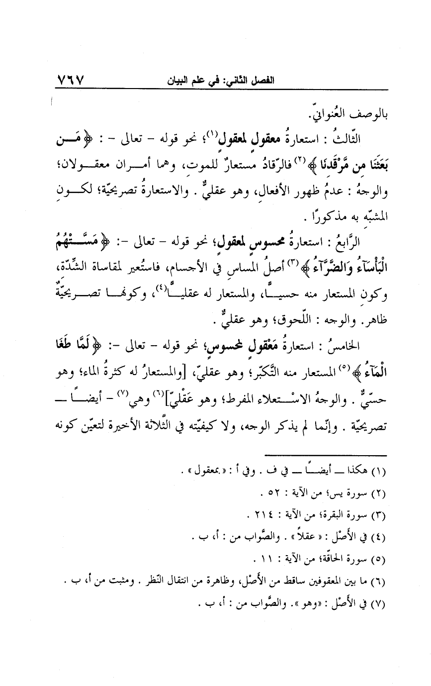 الرَّابعُ: استعارةُ محسوسٍ لمعقولٍ؛ نحو قوله -تعالى-: {مَسَّتْهُمُ الْبَأْسَاءُ وَالضَّرَّاءُ} (¬3) أصلُ المساسِ في الأجسام، فاستُعير لمقاساة الشِّدّة، وكونِ المستعار منه حسيًّا، والمستعار له عقليًّا (¬4)، وكونها تصريحيَّةٌ ظاهر. والوجه: اللّحوق؛ وهو عقليٌّ.