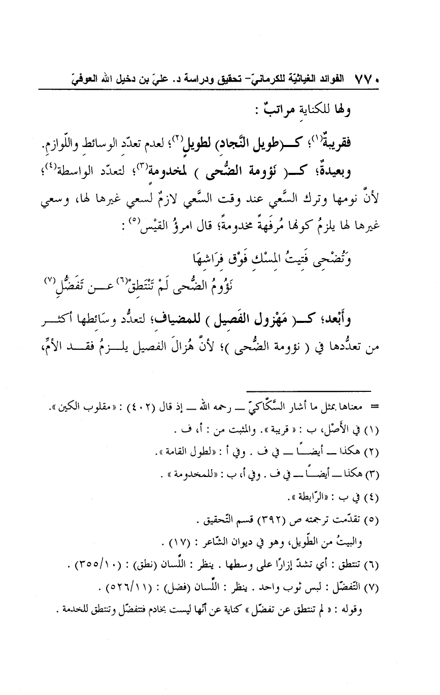 وبعيدةٌ؛ كـ (نؤومة الضُّحى) لخدومةِ (¬3)؛ لتعدّد الواسطة (¬4)؛ لأن نومها وترك السَّعي عند وقت السَّعي لازمٌ لَسعي غيرها لها، وسعي غيرها لها يلزمُ كونها مُرفَهةً مخدومةً؛ قال امرؤُ القيْس (¬5):