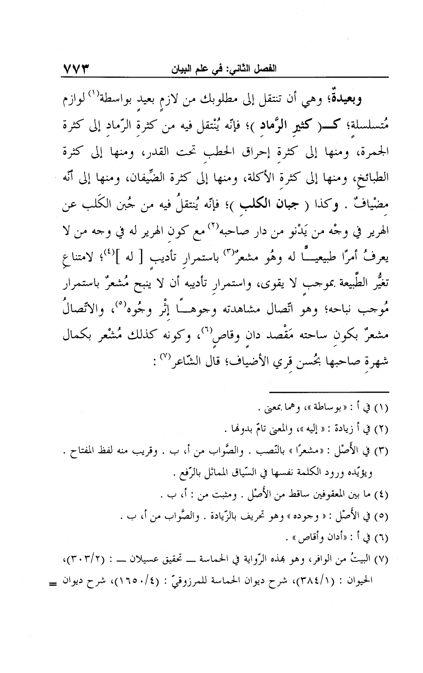 وبعيدةٌ؛ وهي أن تنتقل إلى مطلوبك من لازمٍ بعيدٍ بواسطة (¬1) لوازم مُتسلسلةٍ؛ كـ (كثيرِ الرَّمادِ)؛ فإنّه يُنْتقل فيه من كثرةِ الرّمادِ إلى كثرة الجمرة، ومنها إلى كثرةِ إحراق الحطبِ تحت القدر، ومنها إلى كثرة الطبائخ، ومنها إلى كثرةِ الأكلة، ومنها إلى كثرة الضِّيفان، ومنها إلى أنه مِضْيافٌ. وكذا (جبان الكلبِ)؛ فإنّه يُنتقلُ فيه من جُبن الكَلب عن الهرير في وجْه من يَدْنو من دار صاحبه (¬2) مع كونِ الهرير له في وجه من لا يعرفُ أمرًا طبيعيًّا له وهُو مشعرٌ (¬3) باستمرارِ تأديبٍ [له] (¬4)؛ لامتناع تغيُّر الطبيعة بموجبٍ لا يقوى، واستمرارِ تأديبه أن لا ينبح مُشعرٌ باستمرار مُوجب نباحه؛ وهو اتّصال مشاهدته وجوهًا إِثْر وجُوه (¬5)، والاتّصالُ مشعرٌ بكونِ ساحته مَقْصد دانٍ وقاصٍ (¬6)، وكونه كذلك مُشْعر بكمال شهرةِ صاحبها بحُسن قِري الأضياف؛ قال الشّاعر (¬7):
