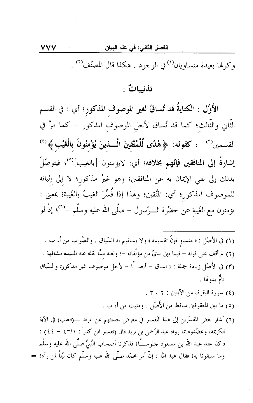 الأَوَّل: الكنايةُ قد تُساقُ لغير الموصوفِ المذكورِ؛ أي: في القسم الثاني والثالثِ، كما قد تُساق لأجلِ الموصوفِ المذكور -كما مرَّ في القسمين (¬3) -، كقوله: {هُدًى لِلْمُتَّقِينَ الَّذِينَ يُؤْمِنُونَ بِالْغَيْبِ} (¬4) إشارةً إلى المنافقين فإنهم بخلافه، أي: لا يؤمنون [بالغيب] (¬5)، فيتوصّلَ بذلك إلى نفي الإيمان به عن المنافقين، وهو غيرُ مذكورٍ، لا إِلى إِثباته للموصوف المذكورِ، أي: المتَّقين، وهذا إذا فُسِّرَ الغيبُ بالغَيبة؛ بمعنى: يؤمنون مع الغَيبةِ عن حضْرة الرّسول - صلى الله عليه وسلم - (¬6)، إذْ لو