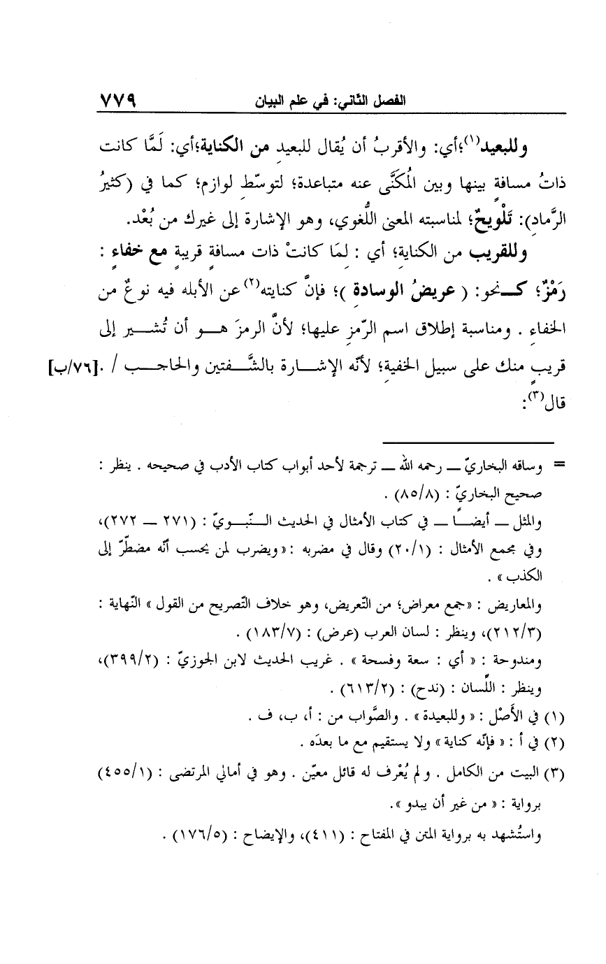 وللبعيد (¬1)؛ أي: والأقربُ أن يقال للبعيدِ من الكناية، أي: لَمَّا كانت ذاتُ مسافة بينها وبين المُكَنَّى عنه متباعدة؛ لتوسّطِ لوازم، كما في (كثيرُ الرَّمادِ): تَلويحٌ؛ لمناسبته المعنى اللّغوي، وهو الإشارة إلى غيرك من بُعْد.