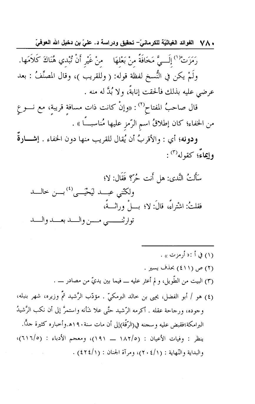 (¬4) هو أبو الفضل، يحيى بن خالد البرمكيّ. مؤدّب الرَّشيد ثم وزيره، شهر بنبله، وجوده، ورجاحة عقله. أكرمه الرّشيد حتَّى علا شَأنه واستمرَّ إلى أن نكب الرشيدُ البرامكة؛ فقبض عليه وسجنه في (الرّقّة) إلى أن مات سنة 190 هـ. وأخباره كثيرة جدًّا.