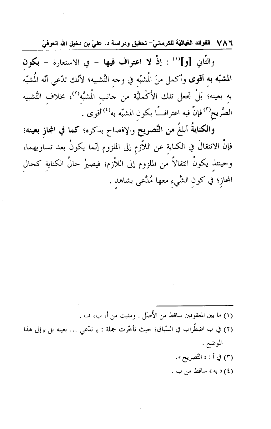 والثاني [و] (¬1): إذْ لا اعتراف فيها -في الاستعارة- بكونِ المشبّه به أقوى وأكمل منَ المُشبّهِ في وجهِ التَّشبيه؛ لأنك تدّعي أنه المُشبّه بهِ بعينه؛ بَلْ تجعل تلك الأَكْمليَّة من جانب المُشبَّهِ (¬2)، بخلافِ التَّشبيه الصَّريح (¬3) فإن فيه اعترافًا بكونِ المشبّه به (¬4) أقوى.