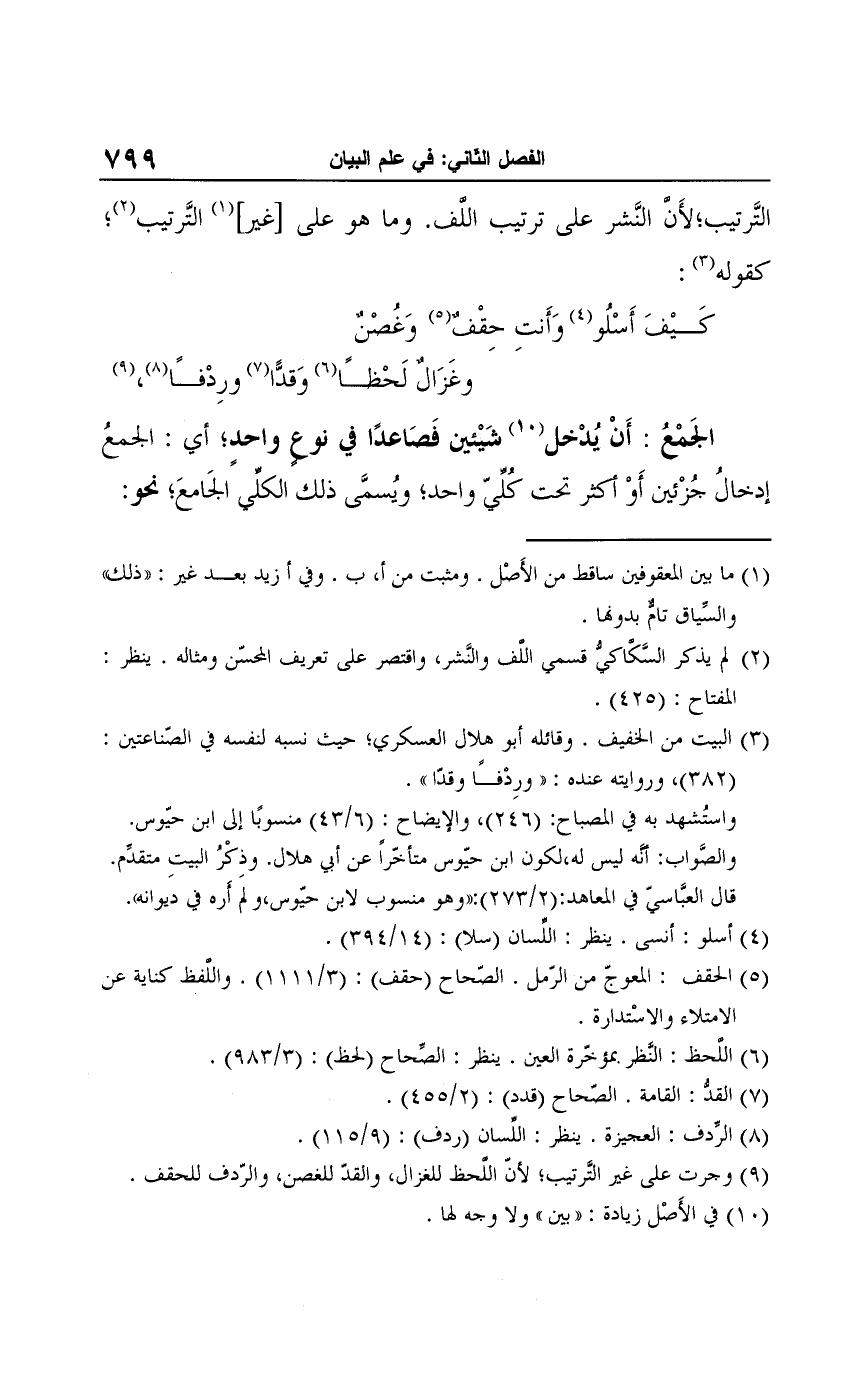 (¬9) وجرت على غير التَّرتيب؛ لأنّ اللحظ للغزال، والقدّ للغصن، والرّدف للحقف.