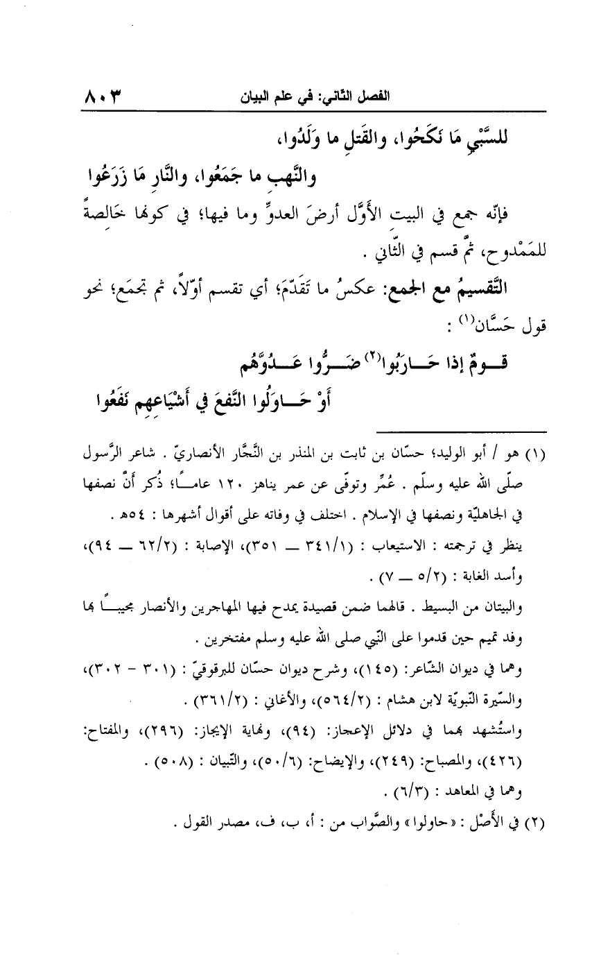 التَّقسيمُ مع الجمع: عكسُ ما تَقَدّمَ، أي تقسم أوّلًا، ثم تجمَع، نحو قول حَسَّان (¬1):