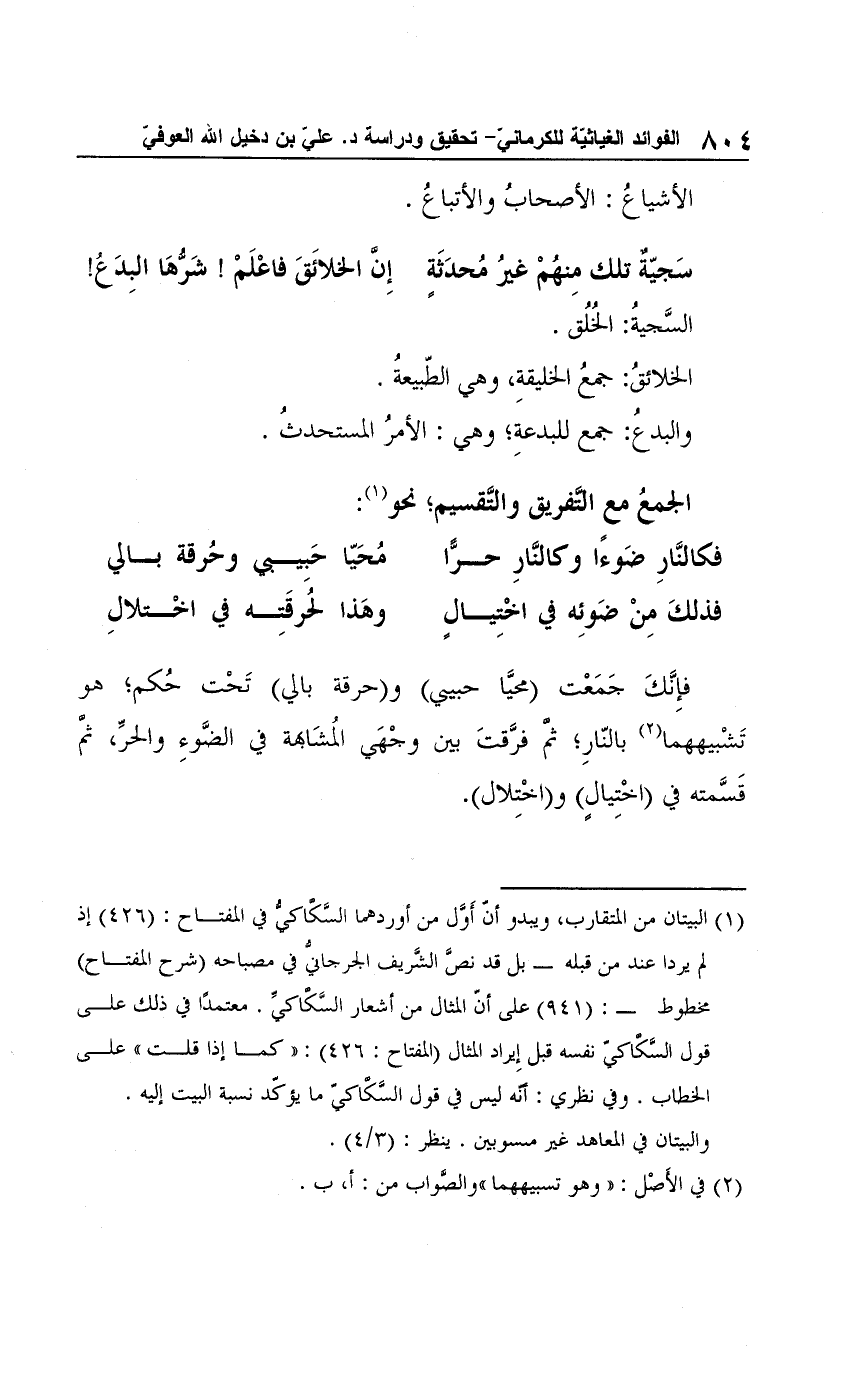 فإِنَّكَ جَمَعْت (محيَّا حبيي) و (حرقة بالي) تَحْت حُكم؛ هو تَشْبيههما (¬2) بالنّارِ؛ ثم فرَّقتَ بين وجْهَي المُشَابهة في الضَّوءِ والحرِّ، ثمَّ قَسَّمته في (اخْتِيالٍ) و (اخْتِلال).