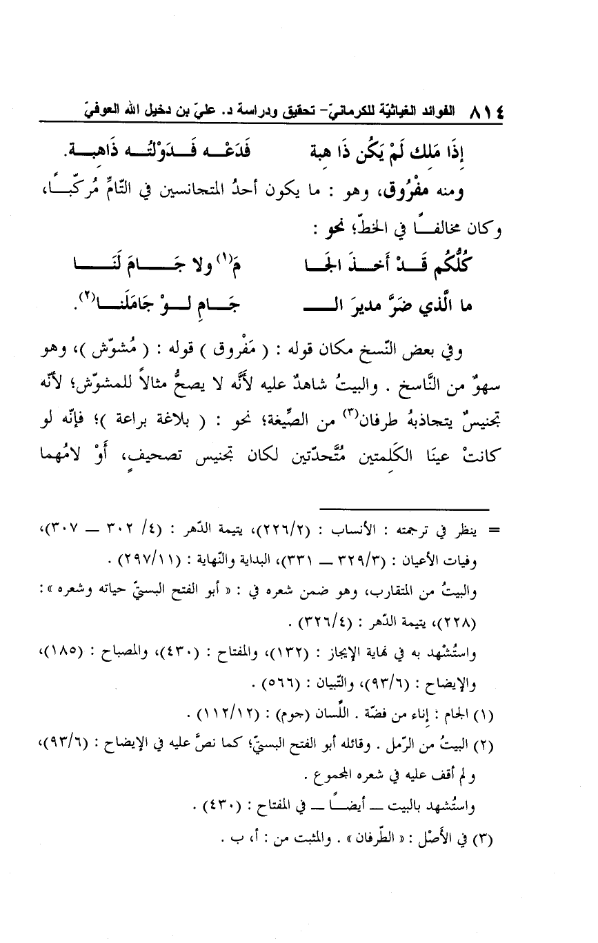 وفي بعض النّسخ مكان قوله: (مَفْروق) قوله: (مُشوّش)، وهو سهوٌ من النَّاسخ. والبيتُ شاهدٌ عليه لأَنَّه لا يصحُّ مثالًا للمشوّش؛ لأنَّه تجنيسٌ يتجاذبهُ طرفان (¬3) من الصِّيغة؛ نحو: (بلاغة براعة)؛ فإنّه لو كانتْ عينَا الكَلِمتين مُتَّحدّتين لكان تجنيس تصحيفٍ، أَوْ لامُهما