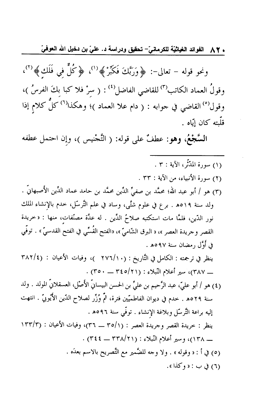 (¬3) هو أبو عبد الله؛ مُحَمَّد بن صفيِّ الدِّين مُحَمَّد بن حامد عماد الدِّين الأَصبهانيّ. ولد سنة 519 هـ. برع في علوم شتَّى، وساد في علم التَّرسّل، خدم بالإِنشاء الملك نور الدّين، فلمَّا مات استكتبه صلاحُ الدِّين. له عدَّة مصنّفاتٍ، منها: "خريدة القصر وجريدة العصر"، "البرق الشّاميّ"، "الفتح القُسِّي في الفتح القدسيّ". تُوفِّي في أَوَّل رمضان سنة 597 هـ.