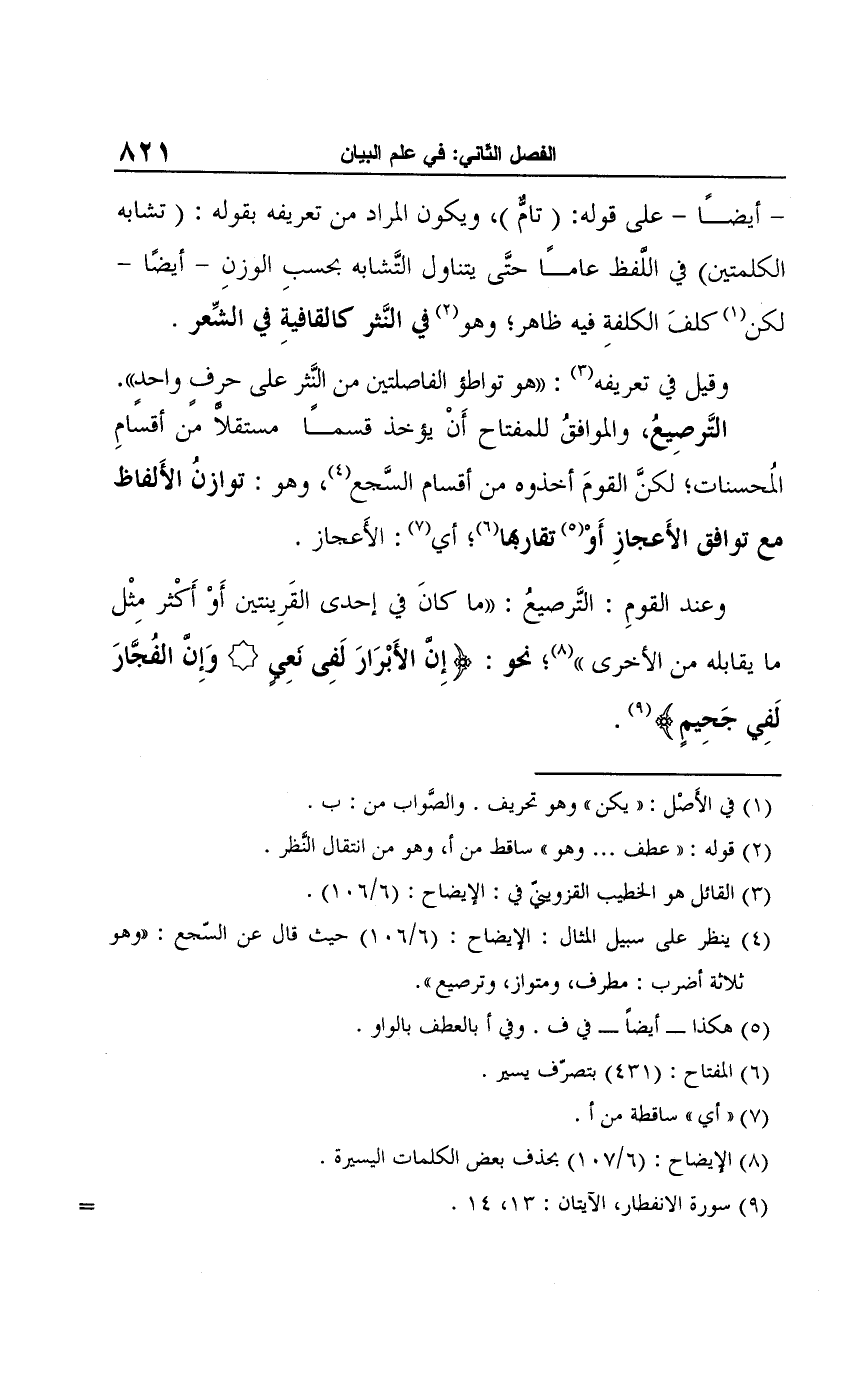 (¬4) ينظر على سبيل المثال: الإيضاح: (6/ 106) حيث قال عن السّجع: "وهو ثلاثة أضرب: مطرف، ومتواز، وترصيع".