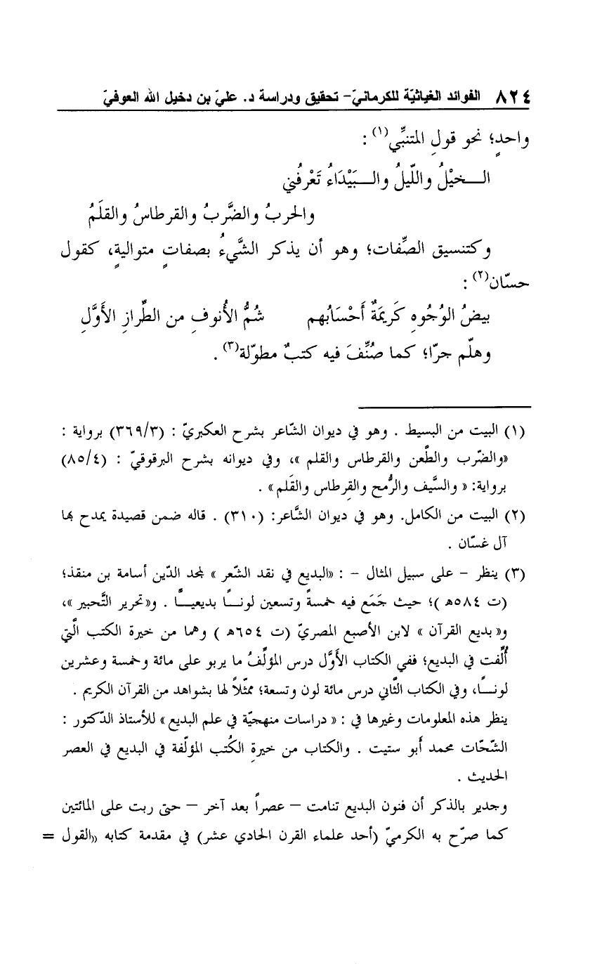 (¬3) ينظر -على سبيل المثال-: "البديع في نقد الشّعر" لمجد الدّين أسامة بن منقذ؛ (ت 584 هـ)؛ حيث جَمَع فيه خمسة وتسعين لونًا بديعيًّا. و"تحرير التَّحبير"، و"بديع القرآن" لابن الأصبع المصريّ (ت 654 هـ) وهما من خيرة الكتب التي أُلِّفت في البديع؛ ففي الكتاب الأَوَّل درس المؤلِّفُ ما يربو على مائة وخمسة وعشرين لونًا، وفي الكتاب الثاني درس مائة لون وتسعة؛ ممثّلًا لها بشواهد من القرآن الكريم. ينظر هذه المعلومات وغيرها في: "دراسات منهجيّة في علم البديع" للأستاذ الدّكتور: الشّحّات محمَّد أبو ستيت. والكتاب من خيرةِ الكُتب المؤلّفة في البديع في العصر الحديث.