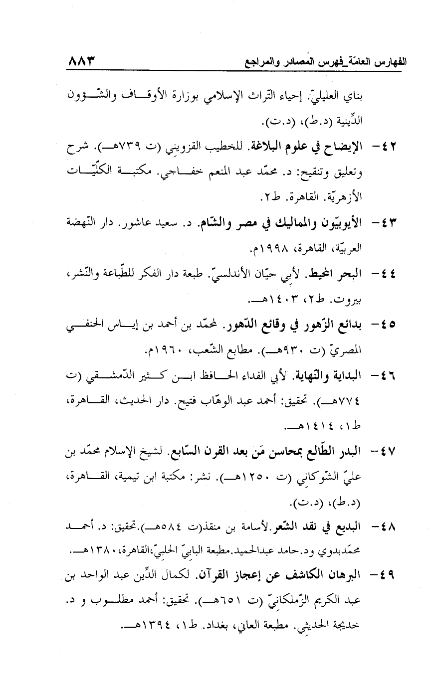 49 - البرهان الكاشف عن إعجاز القرآن. لكمال الدِّين عبد الواحد بن عبد الكريم الزّملكانِيّ (ت 651 هـ). تحقيق: أَحْمد مطلوب ود. خديجة الحديثِي. مطبعة العاني، بغداد. ط 1، 1394 هـ.