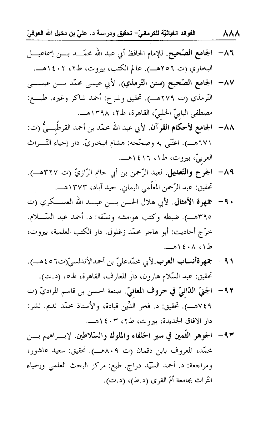 92 - الجنيّ الدّانِيّ في حروف المعانِيّ. صنعة الحسن بن قاسم المراديّ (ت 749 هـ). تحقيق: د. فخر الدِّين قبادة، والأستاذ محمّد نديم. نشر: دار الآفاق الجديدة، بيروت، ط 2، 1403 هـ.