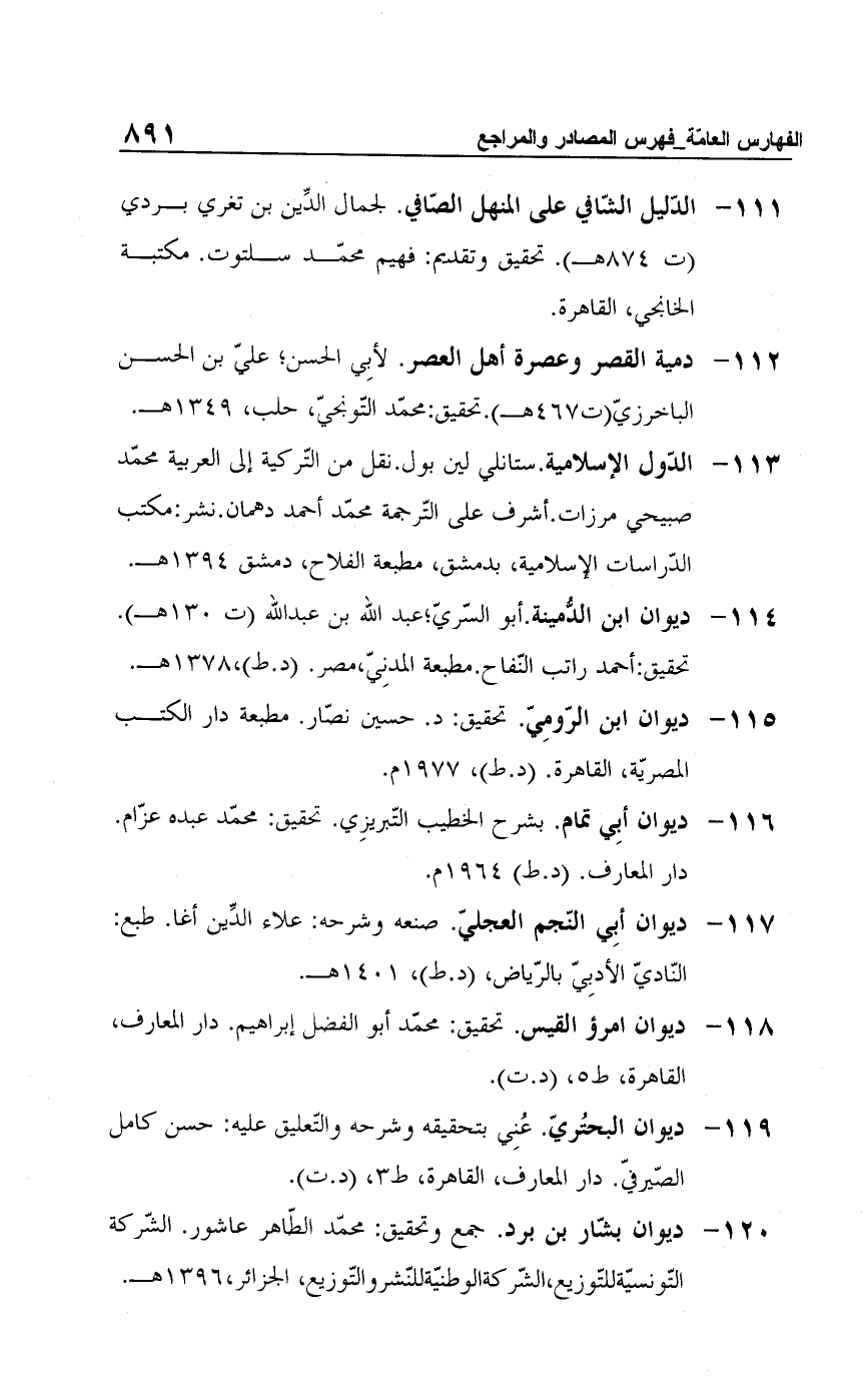 119 - ديوان البحتُريّ. عُنِي بتحقيقه وشرحه والتّعليق عليه: حسن كامل الصّيرفيّ. دار المعارف، القاهرة، ط 3، (د. ت).