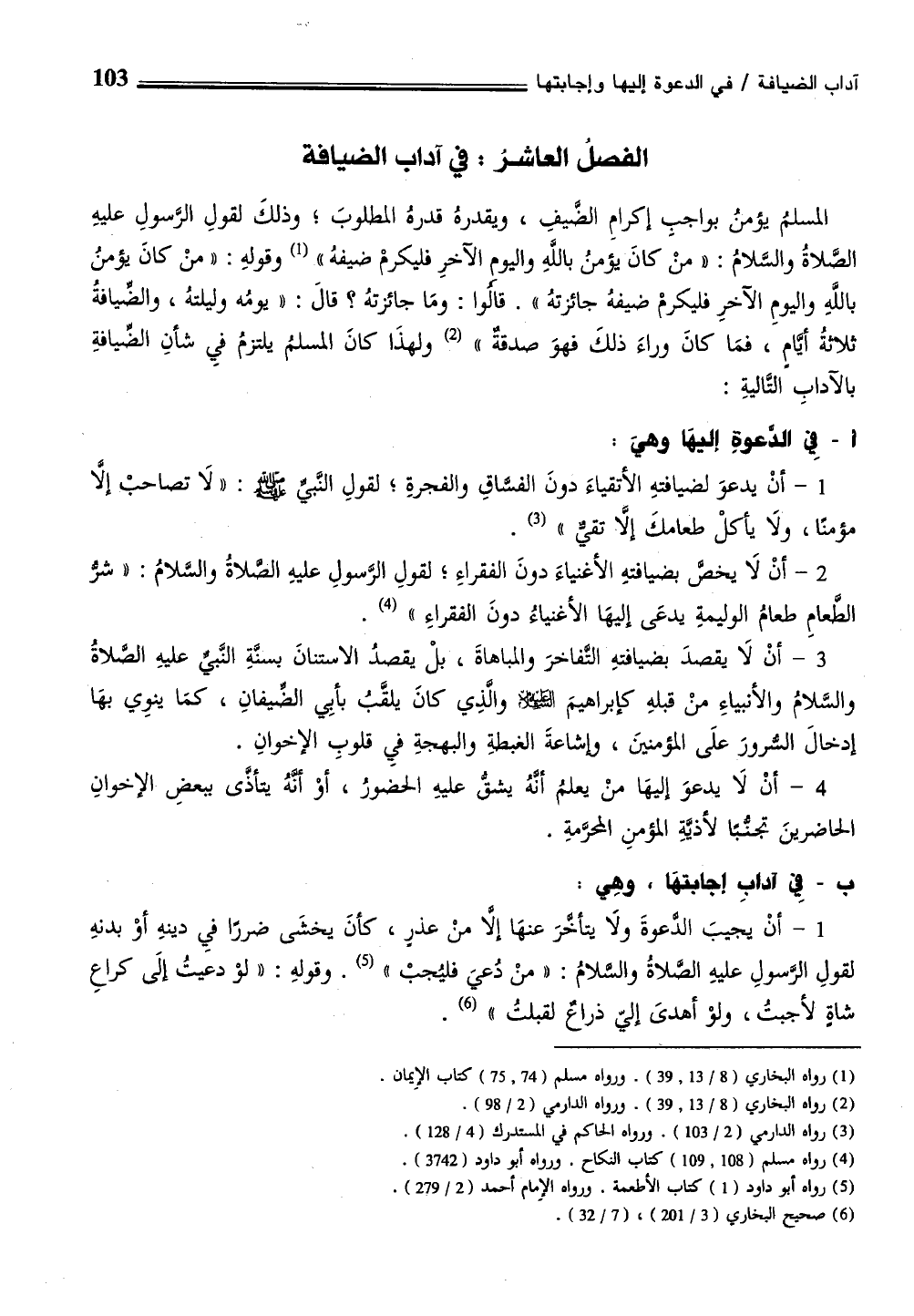 1 - أنْ يجيبَ الدعوةَ ولَا يتأخرَ عنهَا إلاَّ منْ عذرٍ، كأنَ يخشَى ضررًا فيِ دينهِ أوْ بدنهِ لقولِ الرسولِ عليهِ الصلاة والسلامُ: "منْ دُعيَ فليُجبْ" (¬5) . وقولهِ: "لوْ دعيتُ إلَى كراعِ شاةٍ لأجبتُ، ولو أهدىَ إلي ذراعٌ لقبلتُ" (¬6) .