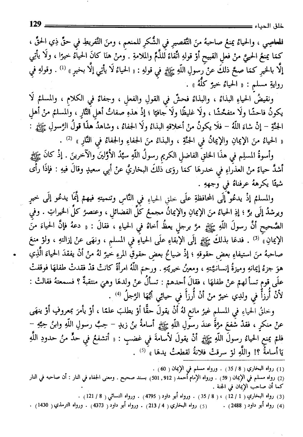 وخلقُ الحياءِ فيِ المسلمِ غيرُ مانع لهُ أنْ يقولَ حقًّا أوْ يطلبَ علمًا، أوْ يأمرَ بمعروفٍ أوْ ينهَى عنْ منكر، فقدْ شفعَ مرةً عندَ رسولِ اللّهِ - صلى الله عليه وسلم - أسامةُ بنُ زيدٍ -حِب رسولِ اللّهِ وابنُ حِبِّهِ- فلم يمنعِ الحياءُ رسولَ اللّهِ - صلى الله عليه وسلم - أنْ يقولَ لأسامةَ في غضبٍ: "أتشفعُ في حد منُ حدودِ اللهِ يَا أسامةُ؟! واللهِ لو سرقتْ فلانةُ لقطعتُ يدهَا" (¬5) .