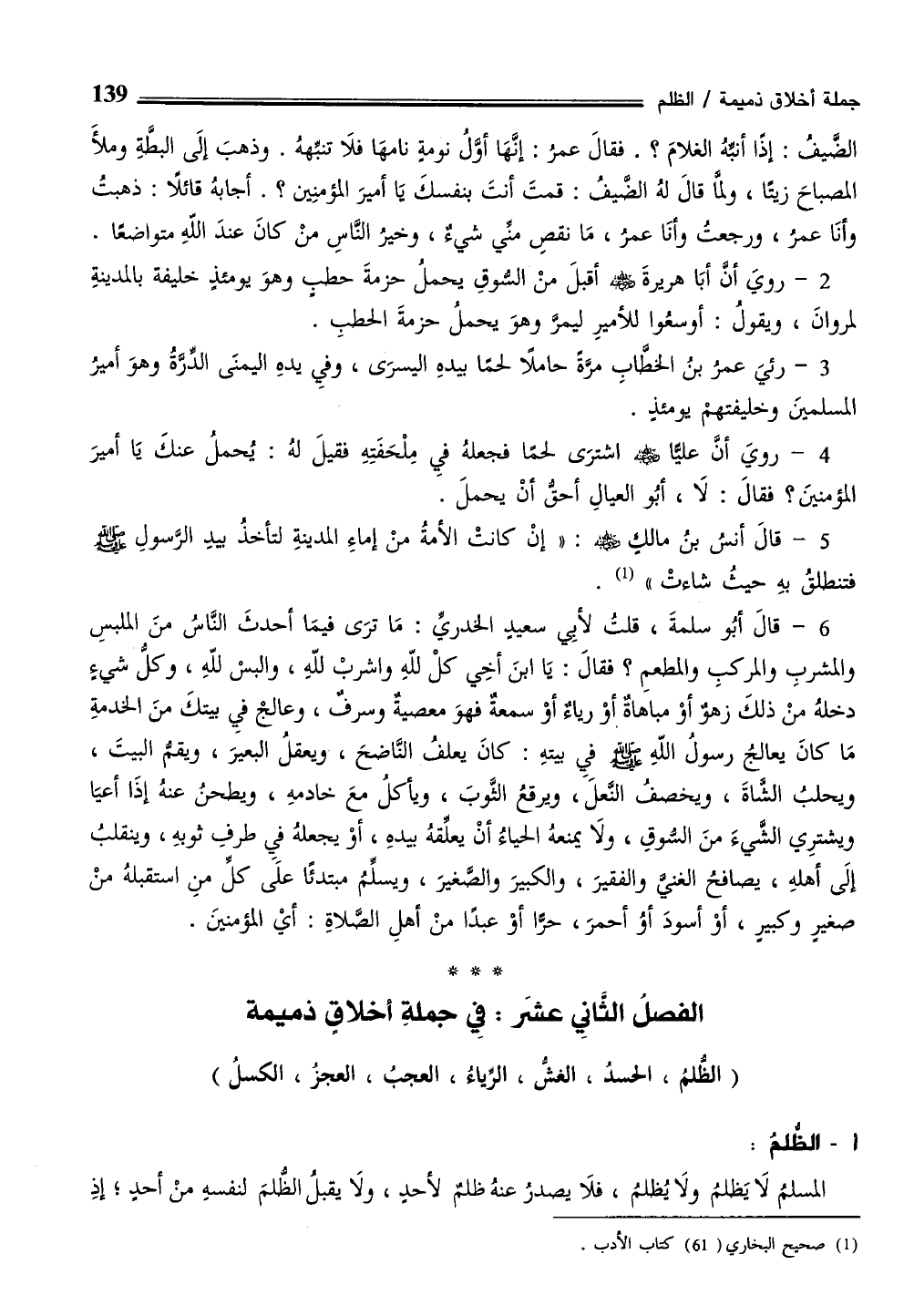 الفصلُ الثّانِي عشرَ: فِي جملةِ أخلاقٍ ذميمة (الظلمُ، الحسدُ، الغش، الرياءُ، العجبُ، العجزُ، الكسلُ)