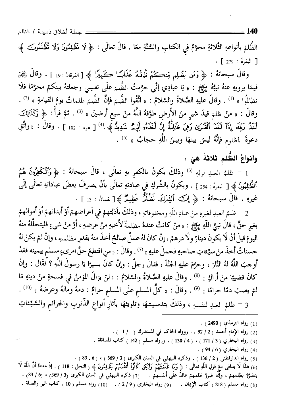 الظُلمُ بأنواعهِ الثَّلاثةِ محرمٌ فيِ الكتابِ والسنةِ معًا. قالَ تعالَى: {لَا تَظْلِمُونَ وَلَا تُظْلَمُونَ} [البقرة: 279].