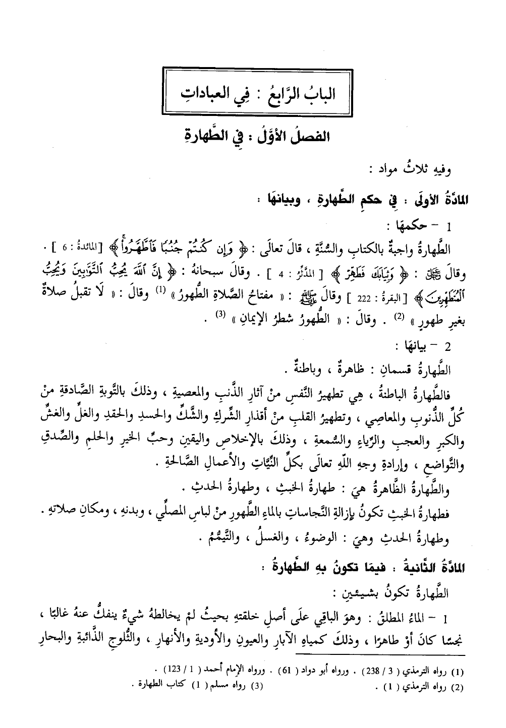 المادةُ الأولَى: فِي حكمِ الطهارةِ، وبيانهَا: