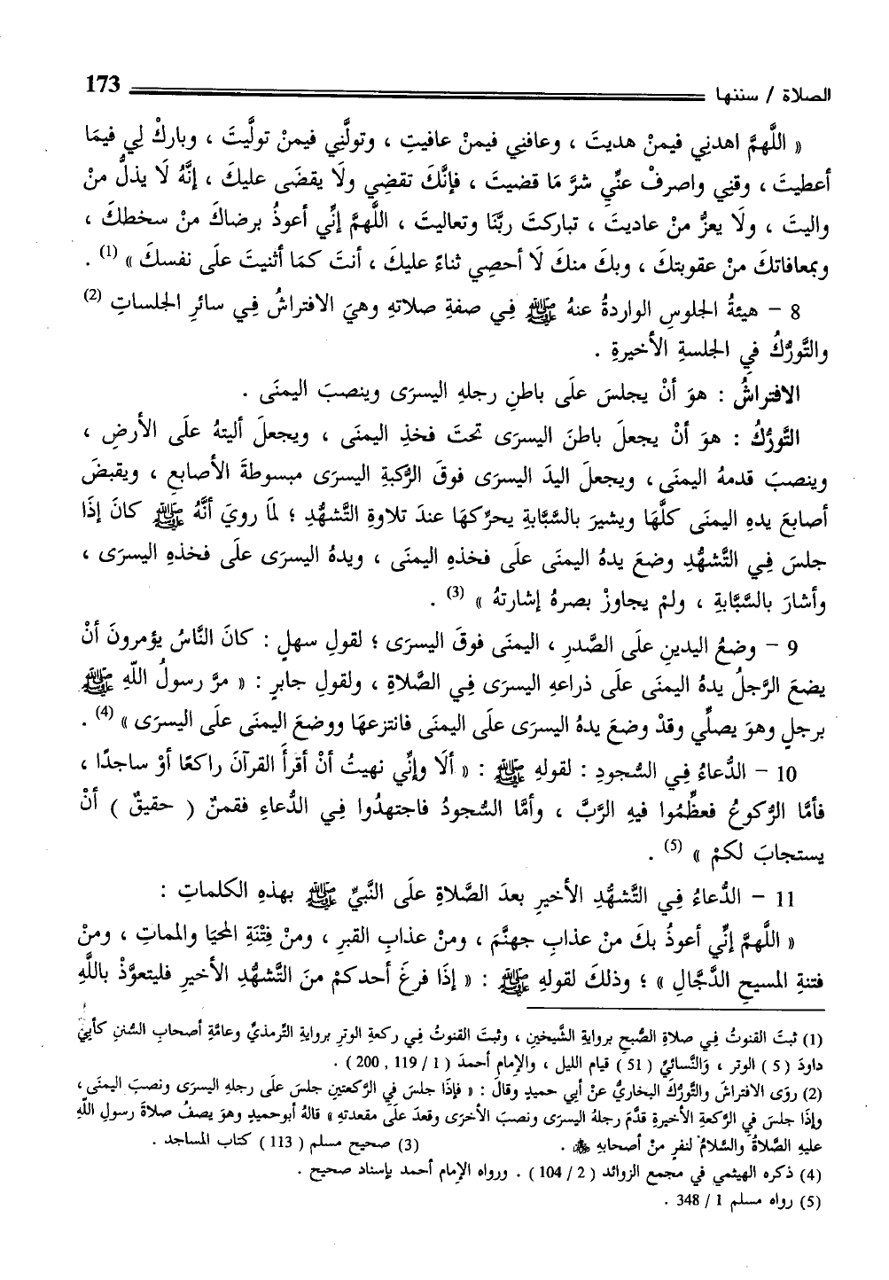 8 - هيئةُ الجلوسِ الواردةُ عنهُ - صلى الله عليه وسلم - فِي صفةِ صلاتهِ وهيَ الافتراش فِي سائرِ الجلساتِ (¬2) والتوركُ فيِ الجلسةِ الأخيرةِ.