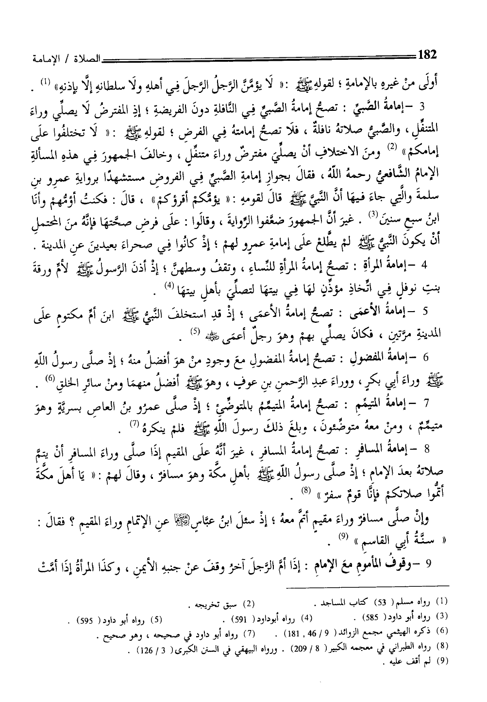 3 - إمامةُ الصبيّ: تصحُّ إمامةُ الصَّبي فِي النَّافلةِ دونَ الفريضةِ، إذِ المفترضُ لَا يصلِّي وراءَ المتنفلِ، والصَّبي صلاتهُ نافلةٌ، فلَا تصحُّ إمامته فِي الفرضِ، لقولهِ - صلى الله عليه وسلم -: "لَا تختلفوا علَى إمامكم" (¬2) ومنَ الاختلافِ أنْ يصليَ مفترضٌ وراءَ متنفِّل، وخالفَ الجمهورَ فِي هذهِ المسألةِ الإمامُ الشَّافعي رحمهُ اللّهُ، فقالَ بجوازِ إمامةِ الصَّبي فِي الفروضِ مستشهدًا بروايةِ عمرِو بنِ سلمةَ والَّتي جاءَ فيهَا أنَّ النبيَّ - صلى الله عليه وسلم - قالَ لقومهِ: "يؤمُّكم أقرؤكم"، قالَ: فكنتُ أؤمُّهم وأنَا ابنُ سبعِ سنينَ (¬3) . غيرَ أنَّ الجمهورَ ضعَّفوا الروايةَ، وقالَوا: علَى فرضِ صحَّتهَا فإنَّهُ منَ المحتملِ أنْ يكونَ النبيُّ - صلى الله عليه وسلم - لم يطَّلعْ علَى إمامةِ عمرٍو لهم؛ إذْ كانُوا فِي صحراءَ بعيدينَ عنِ المدينة.