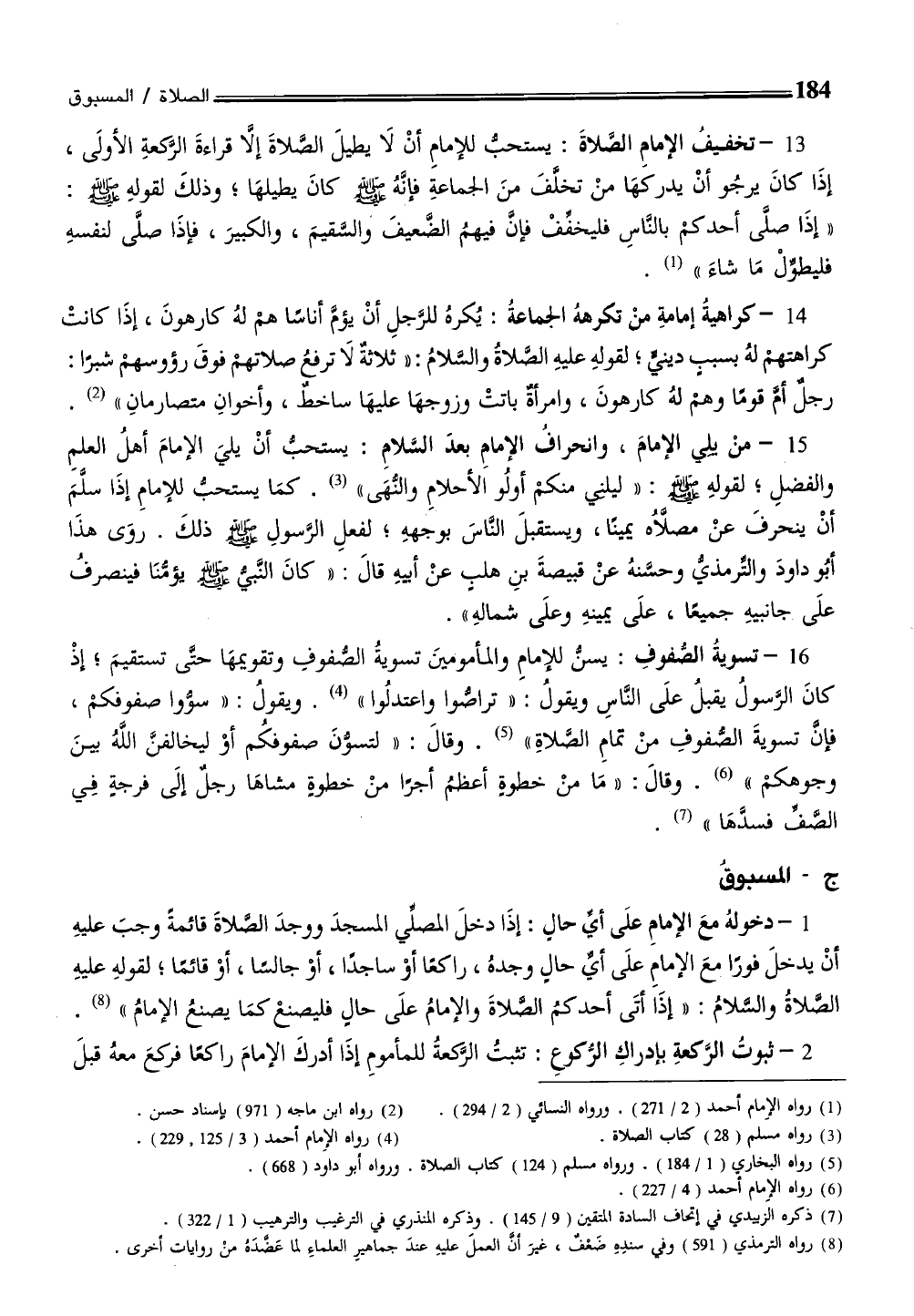 16 - تسويةُ الصفوفِ: يسنُّ للإمامِ والمأمومينَ تسويةُ الصُّفوفِ وتقويمهَا حتَى تستقيمَ؛ إذْ كانَ الرسولُ يقبلُ علَى الناسِ ويقولُ: "تراصُّوا واعتدلُوا" (¬4). ويقولُ: "سوُّوا صفوفكم، فإن تسويةَ الصفوفِ منْ تمامِ الصَّلاةِ" (¬5). وقالَ: "لتسوُّنَ صفوفكُم أوْ ليخالفنَّ اللَّهُ بينَ وجوهكمْ" (¬6). وقالَ: "مَا منْ خطوةٍ أعظمُ أجرًا منْ خطوةٍ مشاهَا رجلٌ إلَى فرجةٍ فِي الصَّف فسدَّهَا" (¬7).