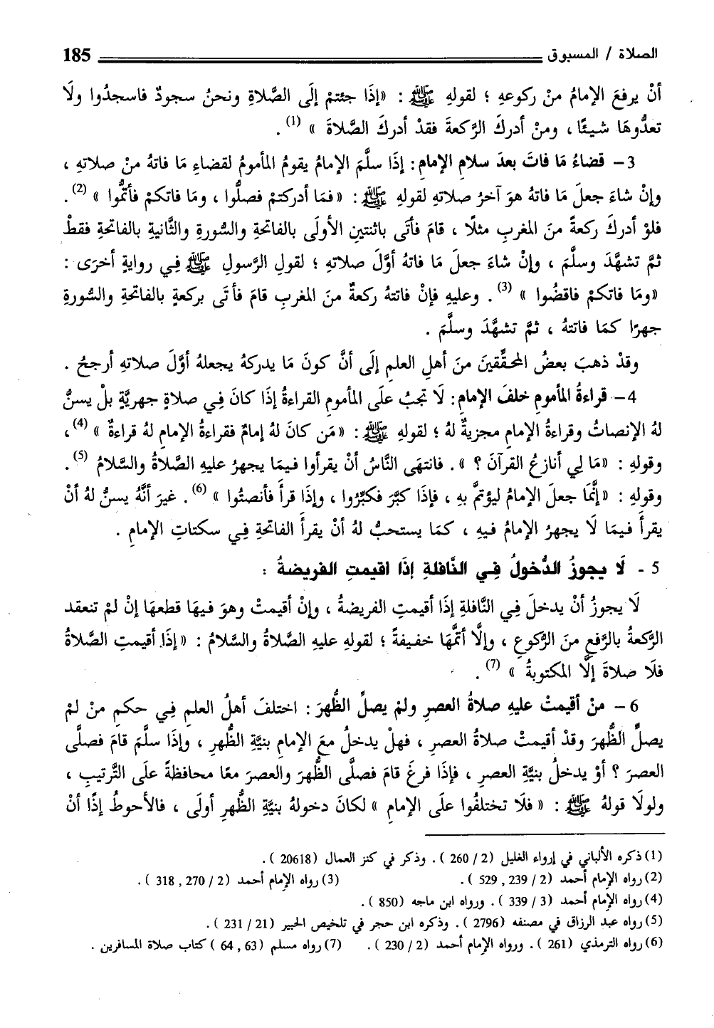 4 - قراءةُ المأمومِ خلفَ الإمامِ: لَا تجبُ علَى المأمومِ القراءةُ إذَا كانَ فِي صلاة جهريَّة بلْ يسنُّ لهُ الإنصاتُ وقراءةُ الإمامِ مجزيةٌ لهُ؛ لقولهِ - صلى الله عليه وسلم -: "مَن كانَ لهُ إمام فقراءةُ الإمامِ لهُ قراءةٌ" (¬4)، وقولهِ: "مَا لي أنازعُ القرآنَ؟ ". فانتهَى النّاسُ أنْ يقرأوا فيمَا يجهرُ عليهِ الصّلاةُ والسّلامُ (¬5).
