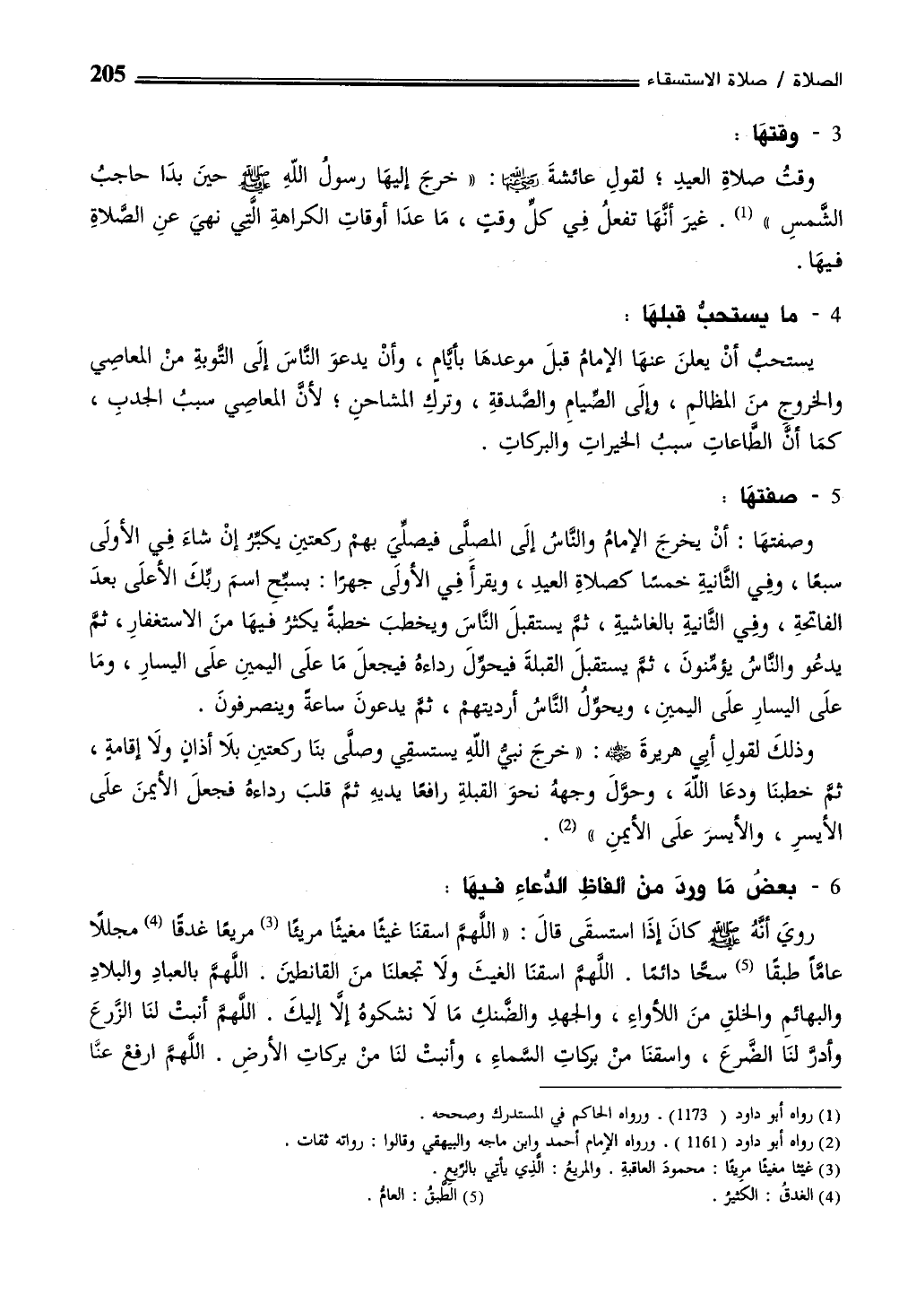 وصفتهَا: أنْ يخرجَ الإمامُ والنَّاسُ إلَى المصلى فيصلِّيَ بهم ركعتيِن يكبرُ إنْ شاءَ فِي الأولَى سبعًا، وفِي الثَّانيةِ خمسًا كصلاةِ العيدِ، ويقرأَ فِي الأولَى جهرًا: بسبِّحِ اسمَ ربِّكَ الأعلَى بعدَ الفاتحةِ، وفِي الثَّانيةِ بالغاشيةِ، ثم يستقبلَ النَّاسَ ويخطبَ خطبةً يكثرُ فيهَا منَ الاستغفارِ، ثم يدعُو والناسُ يؤمِّنونَ، ثم يستقبلَ القبلةَ فيحوِّلَ رداءهُ فيجعلَ مَا علَى اليميِن علَى اليسارِ، ومَا علَى اليسارِ علَى اليمينِ، ويحوِّلُ النَّاسُ أرديتهم، ثم يدعونَ ساعة وينصرفونَ.