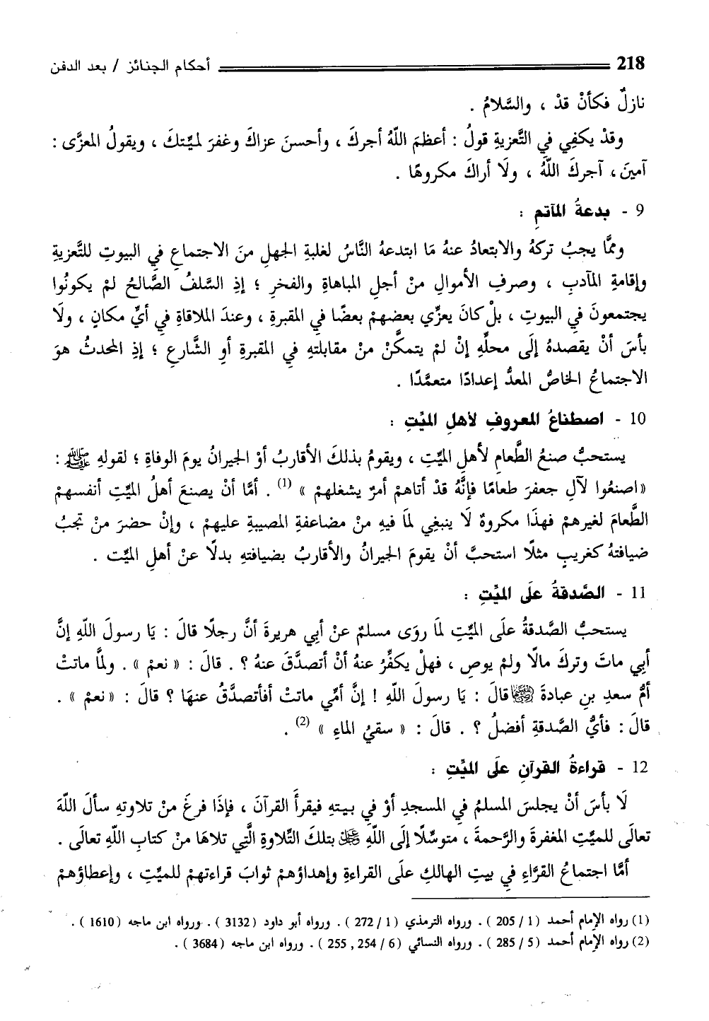 وممَا يجبُ تركهُ والابتعادُ عنهُ مَا ابتدعهُ النَاسُ لغلبةِ الجهلِ منَ الاجتماعِ في البيوتِ للتَّعزيةِ وإقامة المآدبِ، وصرفِ الأموالِ منْ أجلِ المباهاةِ والفخرِ، إذِ السلفُ الصالحُ لم يكونُوا يجتمعونَ فيِ البيوتِ، بلْ كانَ يعزِّي بعضهم بعضًا في المقبرةِ، وعندَ الملاقاةِ فيِ أيِّ مكانٍ، ولَا بأسَ أنْ يقصدهُ إلَى محلِّهِ إنْ لم يتمكنْ منْ مقابلتَهِ في المقبرةِ أوِ الشَّارعِ؛ إذِ المحدثُ هوَ الاجتماعُ الخاص المعدُّ إعدادًا متعمدًا.