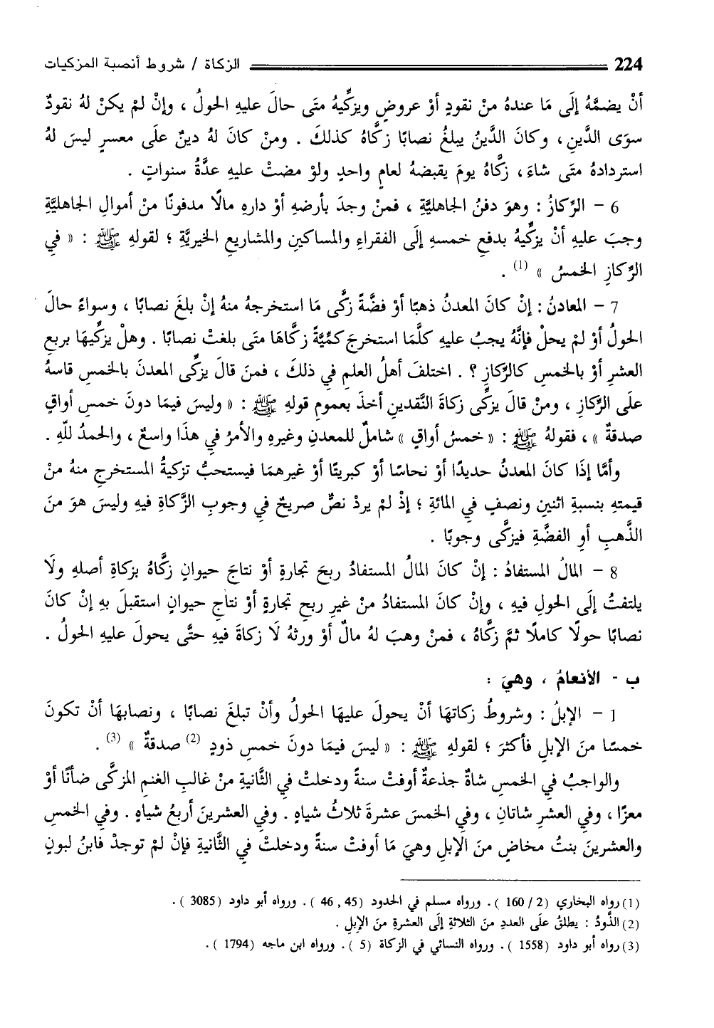 1 - الإبلُ: وشروطُ زكاتهَا أنْ يحولَ عليهَا الحولُ وأنْ تبلغَ نصابًا، ونصابهَا أنْ تكونَ خمسًا منَ الإبلِ فأكثرَ، لقولهِ - صلى الله عليه وسلم -: "ليسَ فيمَا دونَ خمسِ ذود (¬2) صدقةٌ" (¬3) .