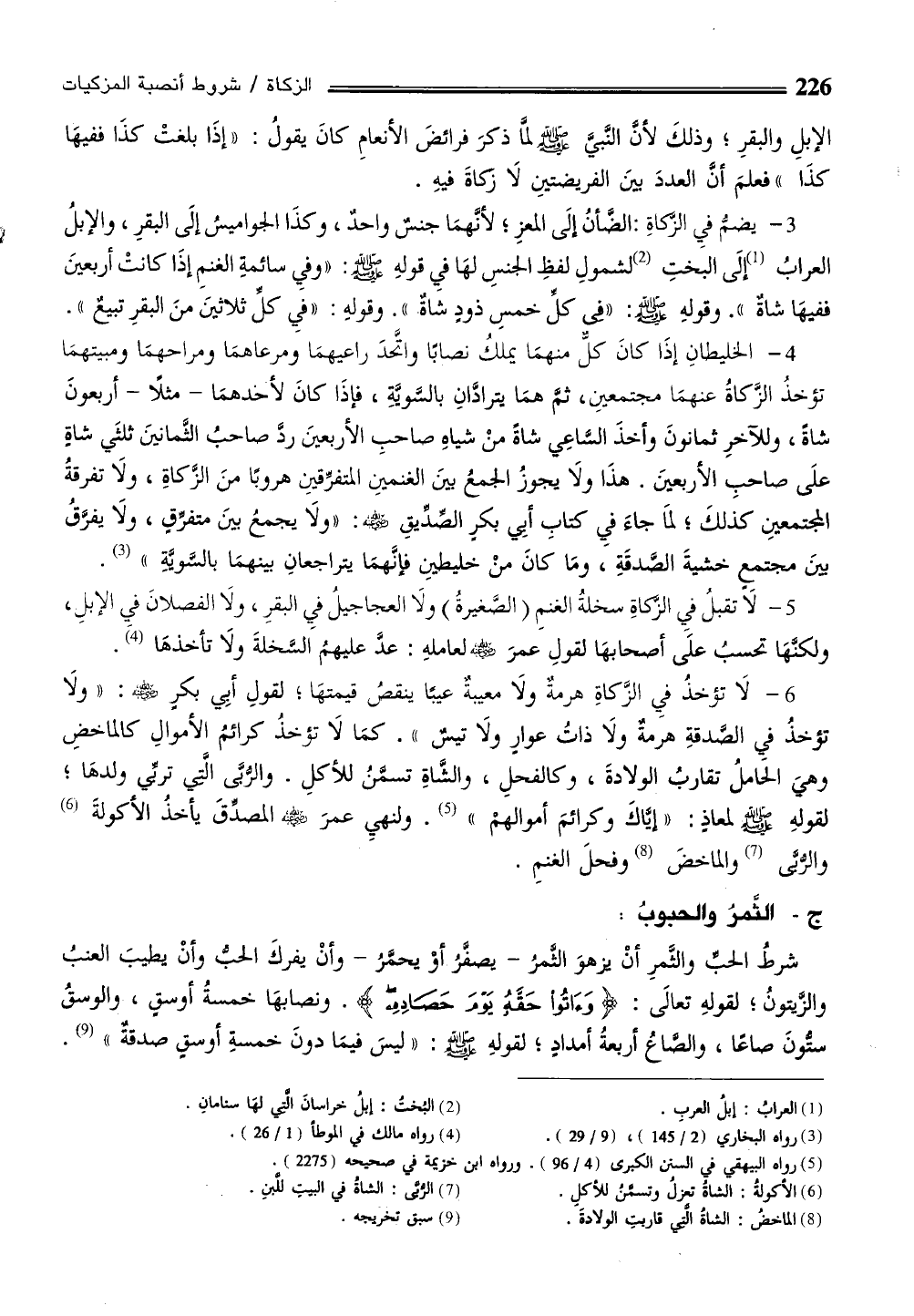 3 - يضمُّ فيِ الزكاةِ: الضَّأنُ إلَى المعزِ؛ لأنهمَا جنسٌ واحدٌ، وكذَا الجواميسُ إلَى البقرِ، والإبلُ العرابُ (¬1) إلَى البختِ (¬2) لشمولِ لفظِ الجنسِ لهَا فيِ قولهِ - صلى الله عليه وسلم -: "وفيِ سائمةِ الغنمِ إذَا كانتْ أربعينَ ففيهَا شاةٌ". وقول - صلى الله عليه وسلم -: "فى كلِّ خمسِ ذودٍ شاةٌ". وقولهِ: "فيِ كلِّ ثلاثينَ منَ البقرِ تبيعٌ".