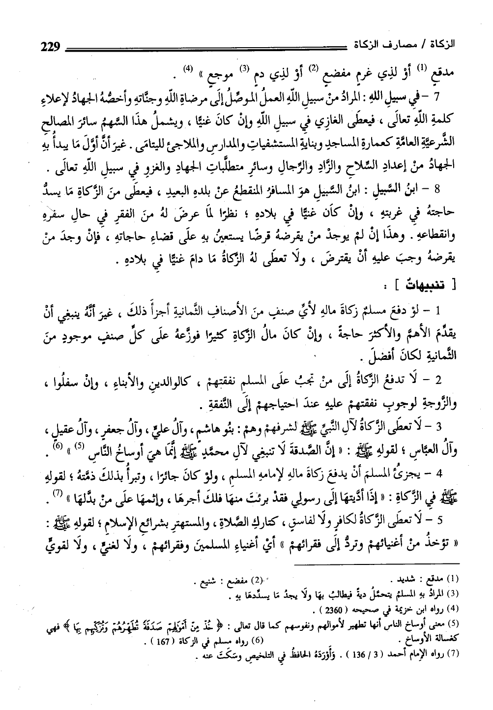 7 - فيِ سبيلِ اللهِ: المرادُ من سبيلِ اللّهِ العملُ الموصِّلُ إلَى مرضاةِ اللّهِ وجنَّاتهِ وأخصُّهُ الجهادُ لإعلاءِ كلمةِ اللّهِ تعالَى، فيعطَى الغازِي فيِ سبيلِ اللّهِ وإنْ كانَ غنيًّا، ويشملُ هذَا السهمُ سائرَ المصالحِ الشرعيةِ العامَّةِ كعمارةِ المساجدِ وبنايةِ المستشفياتِ والمدارسِ والملاجئ لليتامَى. غيرَ أنَّ أوَّلَ مَا يبدأُ بهِ الجهادُ منْ إعدادِ السلاحِ والزادِ والرجالِ وسائرِ متطلباتِ الجهادِ والغزوِ فيِ سبيلِ اللّهِ تعالَى.