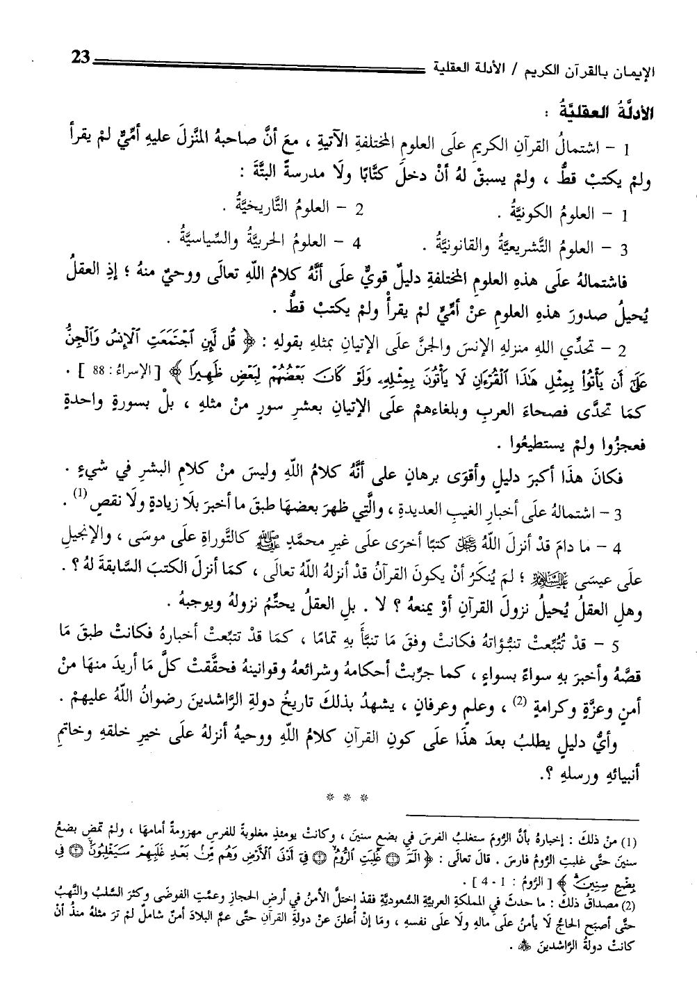 1- اشتمالُ القرآنِ الكريمِ علَى العلومِ المختلفةِ الآتيةِ، معَ أن صاحبهُ المنَّزلَ عليهِ أمِّي لم يقرأ ولم يكتبْ قط، ولم يسبقْ لهُ أنْ دخلَ كتَّابًا ولَا مدرسةً البتَّةَ: