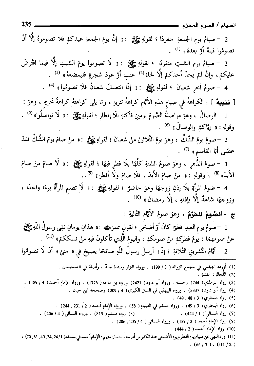 (¬11) ورد النهي عن صيام يوم الفطر ويوم الأضحى عند الكثير من أصحاب السنن منهم: الإمام أحمد في مسنده (1/ 24، 34، 40، 61، 70)، (2/ 511)، (3/ 66).