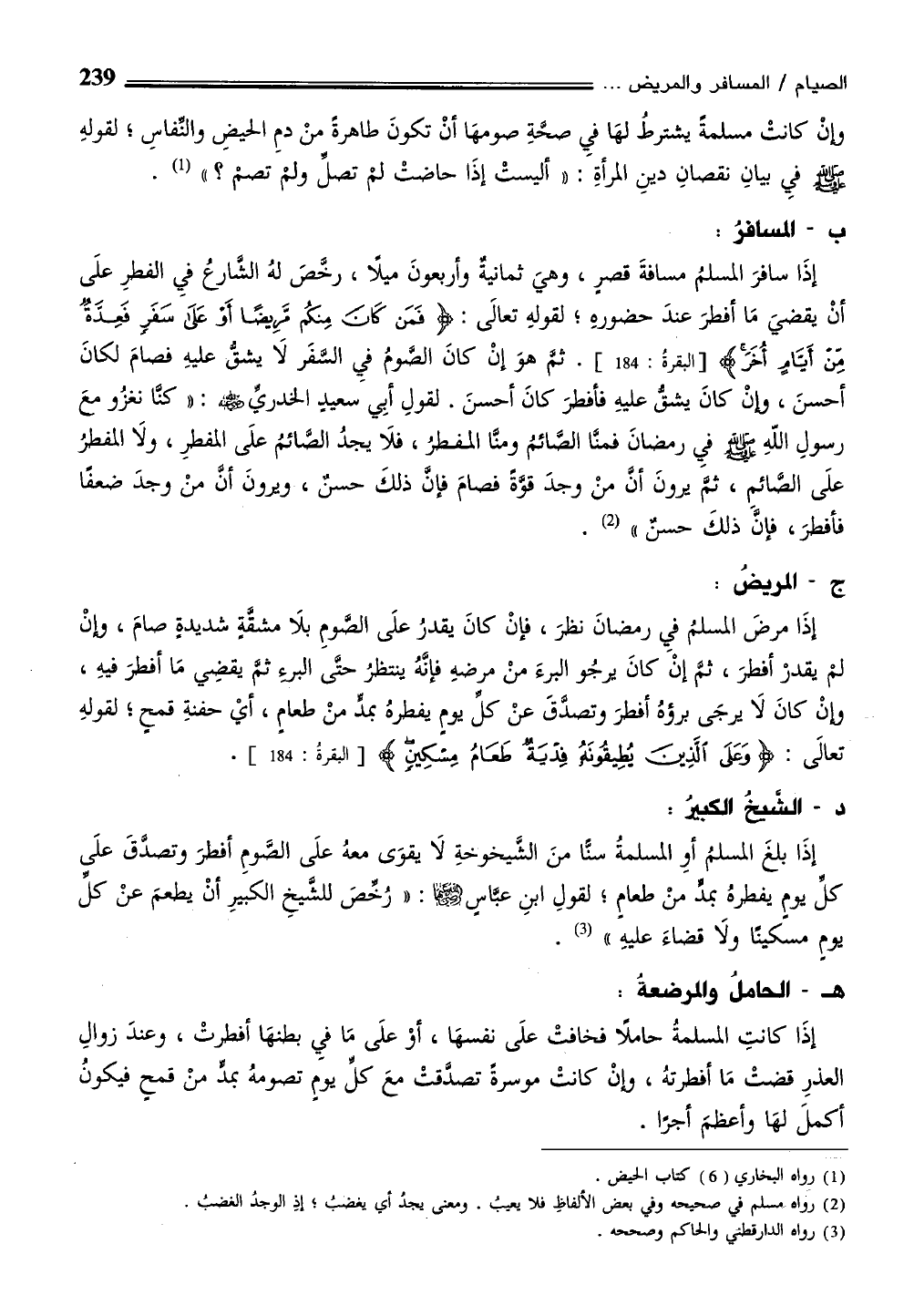 إذَا سافرَ المسلمُ مسافةَ قصرٍ، وهيَ ثمانيةٌ وأربعونَ ميلًا، رخَّصَ لهُ الشارعُ فيِ الفطرِ علَى أنْ يقضيَ مَا أفطرَ عندَ حضورهِ؛ لقولهِ تعالَى: {فَمَنْ كَانَ مِنْكُمْ مَرِيضًا أَوْ عَلَى سَفَرٍ فَعِدَّةٌ مِنْ أَيَّامٍ أُخَرَ} [البقرة: 184]. ثمَّ هوَ إنْ كانَ الصَّومُ فيِ السفَر لَا يشقُّ عليهِ فصامَ لكانَ أحسنَ، وإنْ كانَ يشقُّ عليهِ فأفطرَ كانَ أحسنَ. لقولِ أبِي سعيدٍ الخدري - رضي الله عنه -: "كنا نغزُو معَ رسولِ اللّهِ - صلى الله عليه وسلم - في رمضانَ فمنَّا الصائمُ ومنا المفطرُ، فلَا يجدُ الصائمُ علَى المفطرِ، ولَا المفطرُ علَى الصُّائم، ثم يرونَ أن منْ وجدَ قوَّة فصامَ فإنَّ ذلكَ حسنٌ، ويرونَ أن منْ وجدَ ضعفًا فأفطرَ، فإن ذلكَ حسنٌ" (¬2).
