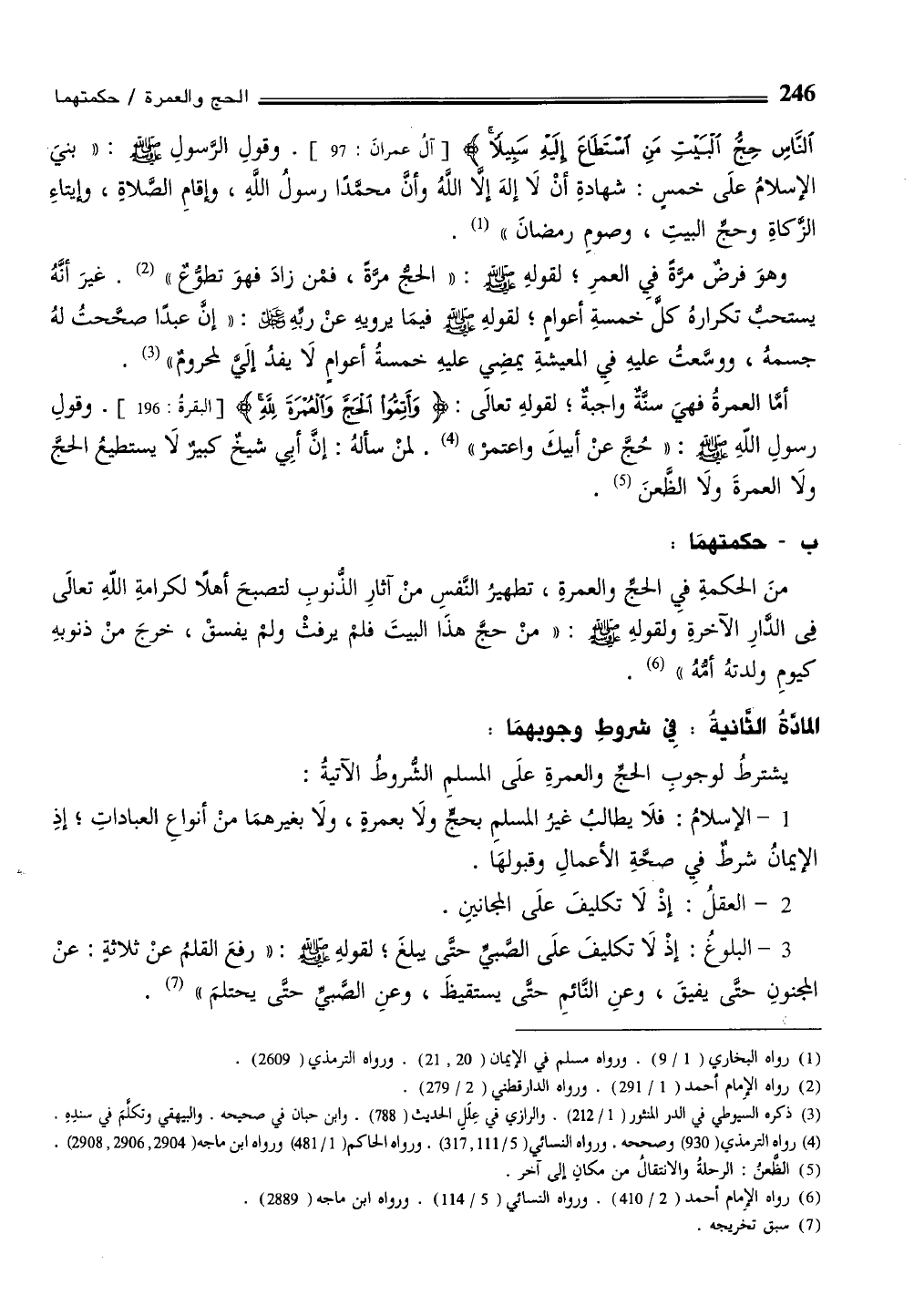 النَّاسِ حِجُّ الْبَيْتِ مَنِ اسْتَطَاعَ إِلَيْهِ سَبِيلًا} [آل عمران: 97]. وقولِ الرسولِ - صلى الله عليه وسلم -: "بنيَ الإسلامُ علَى خمسٍ: شهادةِ أنْ لَا إلهَ إلا اللَّهُ وأنَ محمَّدًا رسولُ اللَّهِ، وإقامِ الصلاةِ، وإيتاءِ الزَّكاة وحجِّ البيتِ، وصومِ رمضانَ" (¬1).