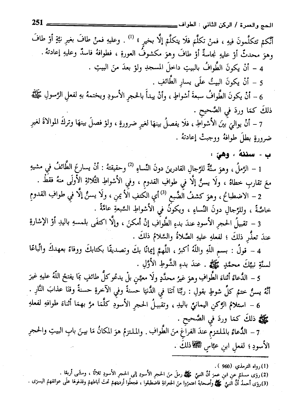 أنكم تتكلمونَ فيهِ، فمنْ تكلمَ فلَا يتكلم إلا بخيرٍ" (¬1) . وعليهِ فمنْ طافَ بغيرِ نيَّةٍ أوْ طافَ وهوَ محدثٌ أو عليهِ نجاسةٌ أو طاف وهوَ مكشوفُ العورةِ، فطوافهُ فاسدٌ وعليهِ إعادتهُ.
