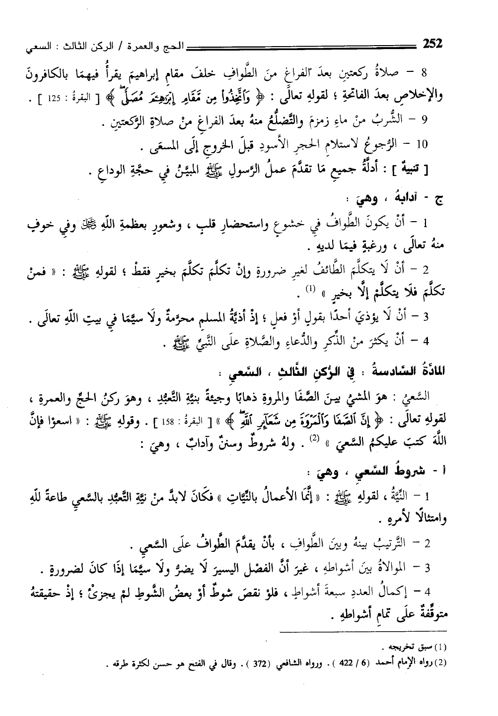 السَّعي: هوَ المشي بينَ الصفَا والمروةِ ذهابًا وجيئةً بنيَّةِ التّعبدِ، وهوَ ركنُ الحجِّ والعمرةِ، لقولهِ تعالَى: {إِنَّ الصَّفَا وَالْمَرْوَةَ مِنْ شَعَائِرِ اللَّهِ} [البقرة: 158]. وقولهِ - صلى الله عليه وسلم -: "اسعوْا فإنَّ اللّهَ كتبَ عليكمُ السَّعيَ" (¬2). ولهُ شروطٌ وسننٌ وآدابٌ، وهيَ: