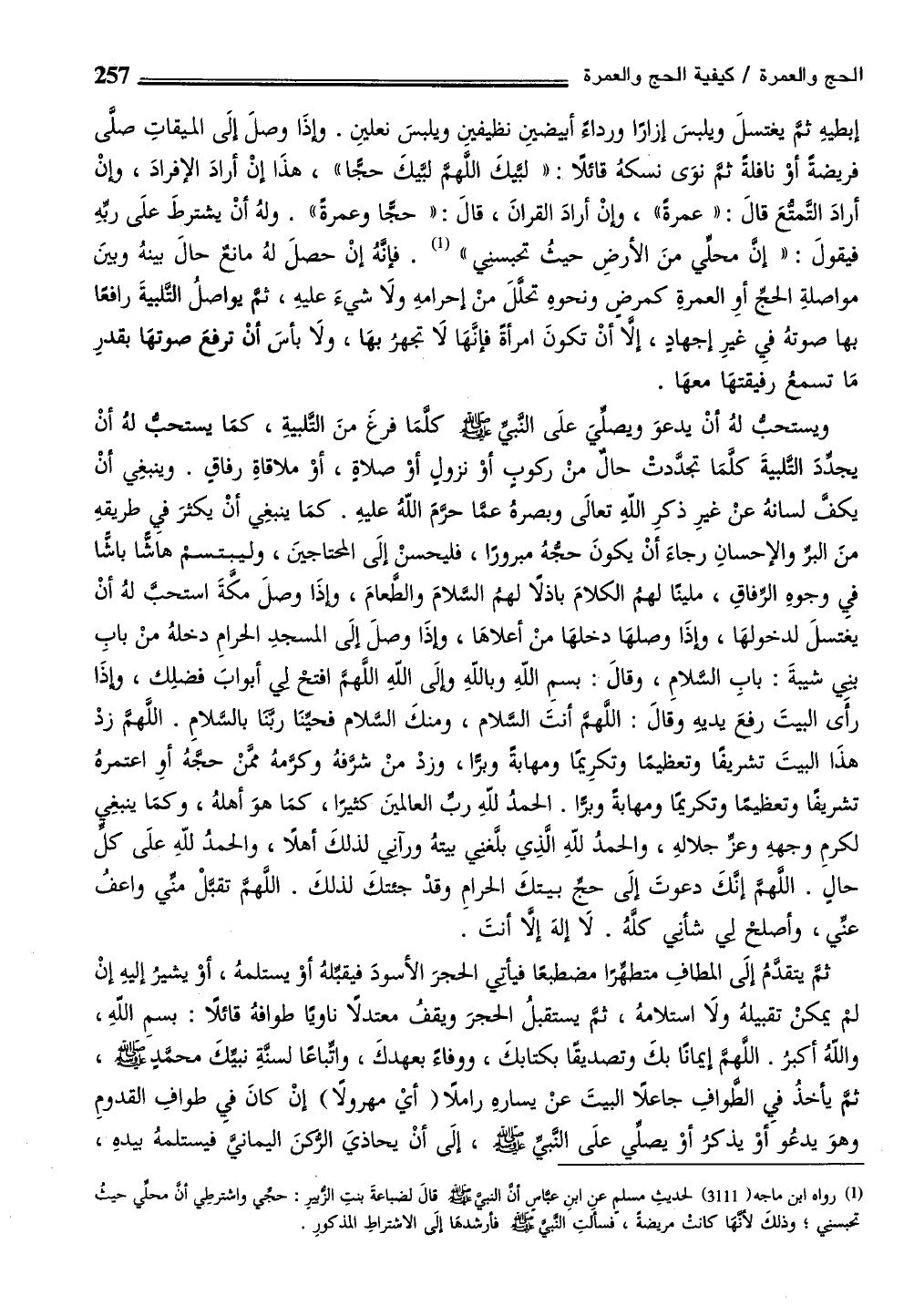(¬1) رواه ابن ماجه (3111) لحديثِ مسلم عن ابن عباس أن النبيَّ - صلى الله عليه وسلم - قالَ لضباعةَ بنتِ الزبير: حجي واشترطِي أن محلي حيثُ تحبسني؛ وذلك لأنهَا كانتْ مريضةً، فسألتِ النبيَّ - صلى الله عليه وسلم - فأرشدهَا إلَى الاشتراطِ المذكور.