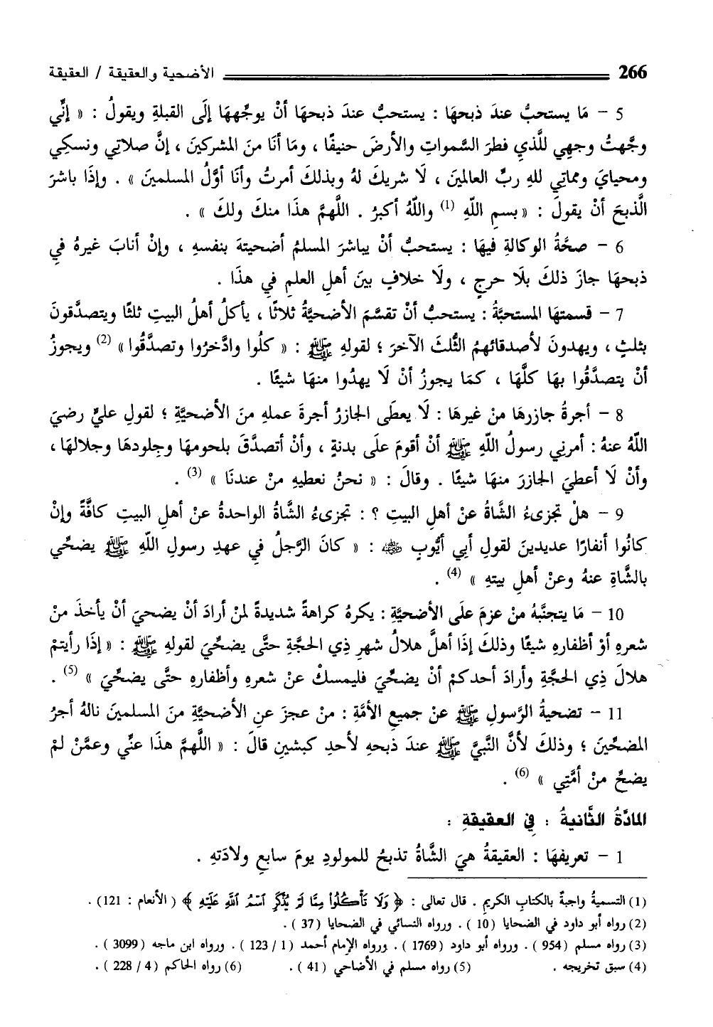 5 - مَا يستحب عندَ ذبحهَا: يستحبُّ عندَ ذبحهَا أنْ يوجههَا إلَى القبلةِ ويقولُ: "إني وجَّهتُ وجهِي للذيِ فطرَ السمواتِ والأرضَ حنيفًا، ومَا أنَا منَ المشركينَ، إن صلاتي ونسكِي ومحيايَ ومماتي لله ربِّ العالمينَ، لَا شريكَ لهُ وبذلكَ أمرتُ وأنَا أولُ المسلمينَ". وإذَا باشرَ الذبحَ أنْ يقولَ: "بسمِ اللّهِ (¬1) و الله أكبرُ. اللهم هذَا منكَ ولكَ".