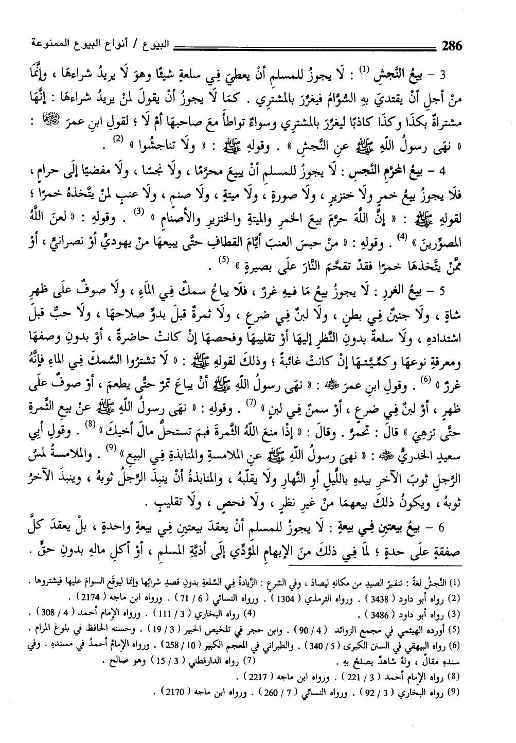 5 - بيعُ الغررِ: لَا يجوزُ بيعُ مَا فيهِ غررٌ، فلَا يبيع سمكٌ فِي الماَءِ، ولَا صوفٌ علَى ظهرِ شاةٍ، ولَا جنينٌ فِي بطن، ولَا لبنٌ فِي ضرع، ولَا ثمرة قبلَ بدوِّ صلاحهَا، ولَا حبٌّ قبلَ اشتدادهِ، ولَا سلعةٌ بدونِ النظرِ إليهَا أو تقليبهَا وفحصهَا إنْ كانتْ حاضرةً، أوْ بدونِ وصفهَا ومعرفةِ نوعهَا وكميتهَا إنْ كانتْ غائبةً، وذلكَ لقولهِ - صلى الله عليه وسلم -: "لَا تشتروا السمكَ فِي الماءِ فإنَهُ غرر" (¬6) . وقولِ ابنِ عمرَ - رضي الله عنه -: "نهَى رسولُ اللّهِ - صلى الله عليه وسلم -" أنْ يباعَ تمر حتى يطعمَ، أوْ صوفٌ علَى ظهرٍ، أوْ لبنٌ فِي ضرعٍ، أوْ سمنٌ فِي لبنٍ" (¬7) . وقولهِ: "نهَى رسولُ اللّهِ - صلى الله عليه وسلم - عنْ بيعِ الثَّمرةِ حتى تزهِيَ" قالَ: تحمر. وقالَ:" إذْا منعَ اللّهُ الثَّمرةَ فبمَ تستحلُّ مالَ أخيكَ" (¬8) . وقولِ أبي سعيدٍ الخدريُّ - رضي الله عنه -: "نهىَ رسولُ اللّهِ - صلى الله عليه وسلم - عنِ الملامسةِ والمنابذةِ فِي البيعِ" (¬9) . والملامسةُ لمسُ الرَّجلِ ثوبَ الآخرِ بيدهِ بالليلِ أوِ النَّهارِ ولَا يقلّبهُ، والمنابذةُ أنْ ينبِذَ الرجلُ ثوبهُ، وينبذَ الآخرُ ثوبهُ، ويكونُ ذلكَ بيعهمَا منْ غيرِ نظرٍ، ولَا فحصٍ، ولَا تقليبٍ.