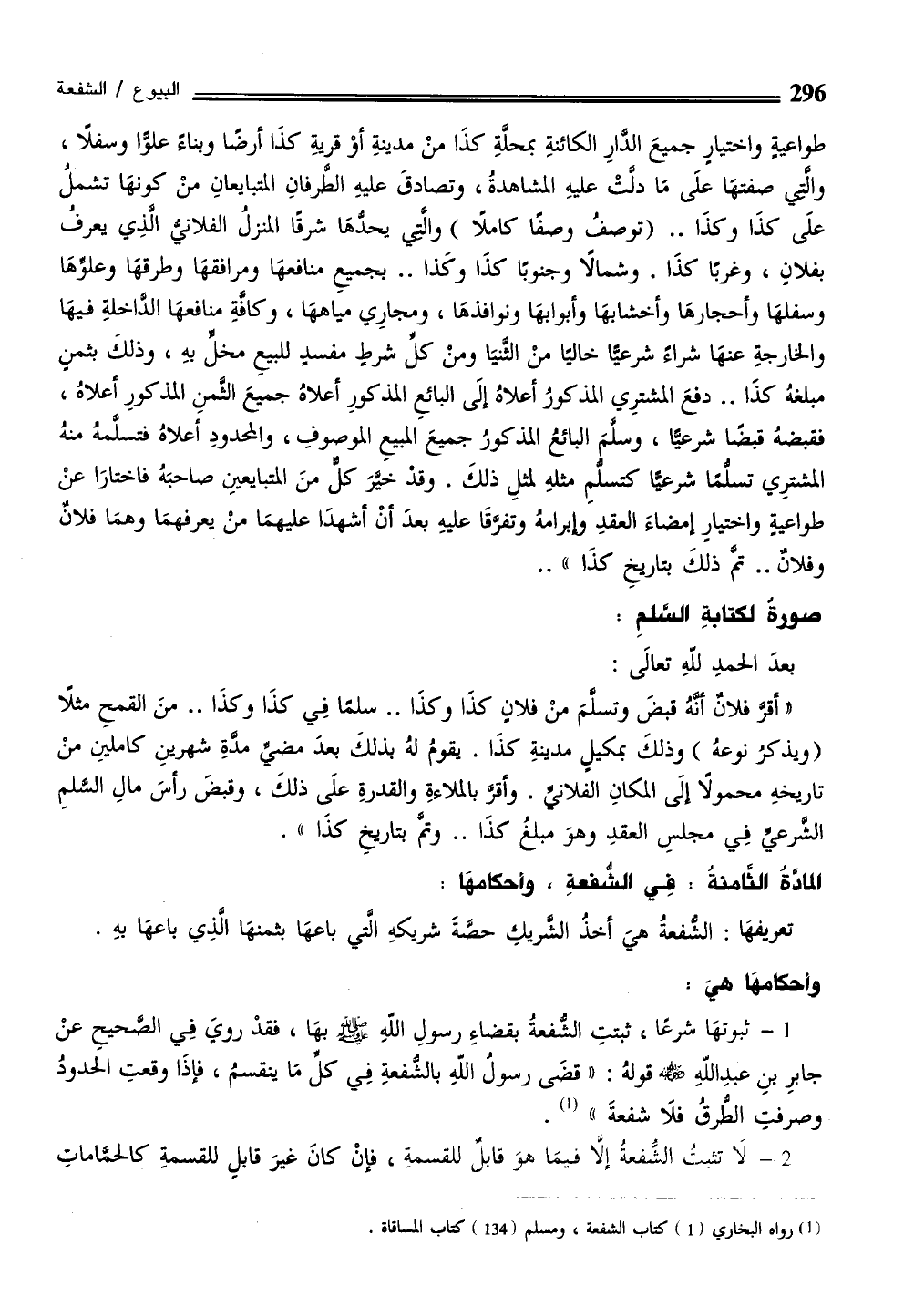 طواعية واختيارٍ جميعَ الدَّارِ الكائنةِ بمحلةِ كذَا منْ مدينةِ أوْ قريةِ كذَا أرضًا وبناءً علوًّا وسفلًا، والّتي صفتهَا علَى مَا دلّتْ عليهِ المشاهدةُ، وتصادقَ عليهِ الطرفانِ المتبايعانِ منْ كونهَا تشملُ علَى كذَا وكذَا .. (توصفُ وصفًا كاملًا) واتي يحدُّهَا شرقًا المنزلُ الفلاني الذِي يعرف بفلان، وغربًا كذَا. وشمالًا وجنوبًا كذَا وكَذا .. بجميعِ منافعهَا ومرافقهَا وطرقهَا وعلوِّهَا وسفلهَا وأحجارهَا وأخشابهَا وأبوابهَا ونوافذهَا، ومجارِي مياههَا، وكافَّةِ منافعهَا الداخلةِ فيهَا والخارجةِ عنهَا شراءً شرعيًّا خاليًا منْ الثَّنيَا ومنْ كلِّ شرطٍ مفسدٍ للبيعِ مخل بهِ، وذلكَ بثمنٍ مبلغهُ كذَا .. دفعَ المشترِي المذكورُ أعلاهُ إلَى البائعِ المذكررِ أعلاهُ جميعَ الثمنِ المذكورِ أعلاهُ، فقبضهُ قبضًا شرعيًّا، وسلمَ البائع ُ المذكورُ جميعَ المبيعِ الموصوفِ، والمحدودِ أعلاهُ فتسلَّمهُ منهُ المشترِي تسلُّمًا شرعيًّا كتسلُّمِ مثلهِ لمثلِ ذلكَ. وقدْ خيَّرَ كل منَ المتبايعيِن صاحبَهُ فاختارَا عنْ طواعيةٍ واختيارٍ إمضاءَ العقدِ وإبرامهُ وتفرَّقَا عليهِ بعدَ أنْ أشهدَا عليهمَا منْ يعرفهمَا وهمَا فلانٌ وفلانٌ .. تم ذلكَ بتاريخِ كذَا" ..