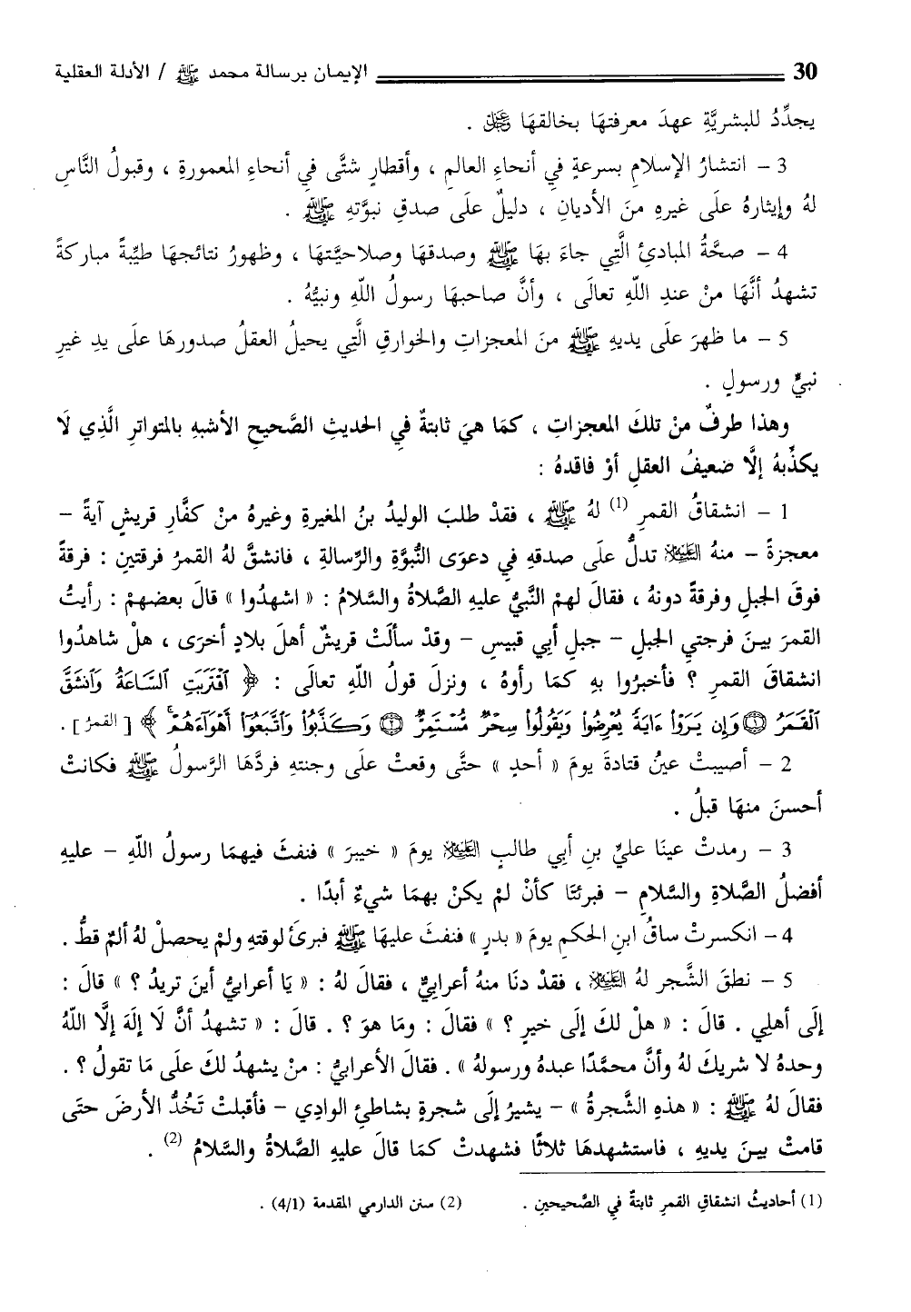 5 - ما ظهرَ علَى يديهِ - صلى الله عليه وسلم - منَ المعجزاتِ والخوارقِ التي يحيلُ العقلُ صدورهَا علَى يدِ غيرِ نبي ورسولٍ.