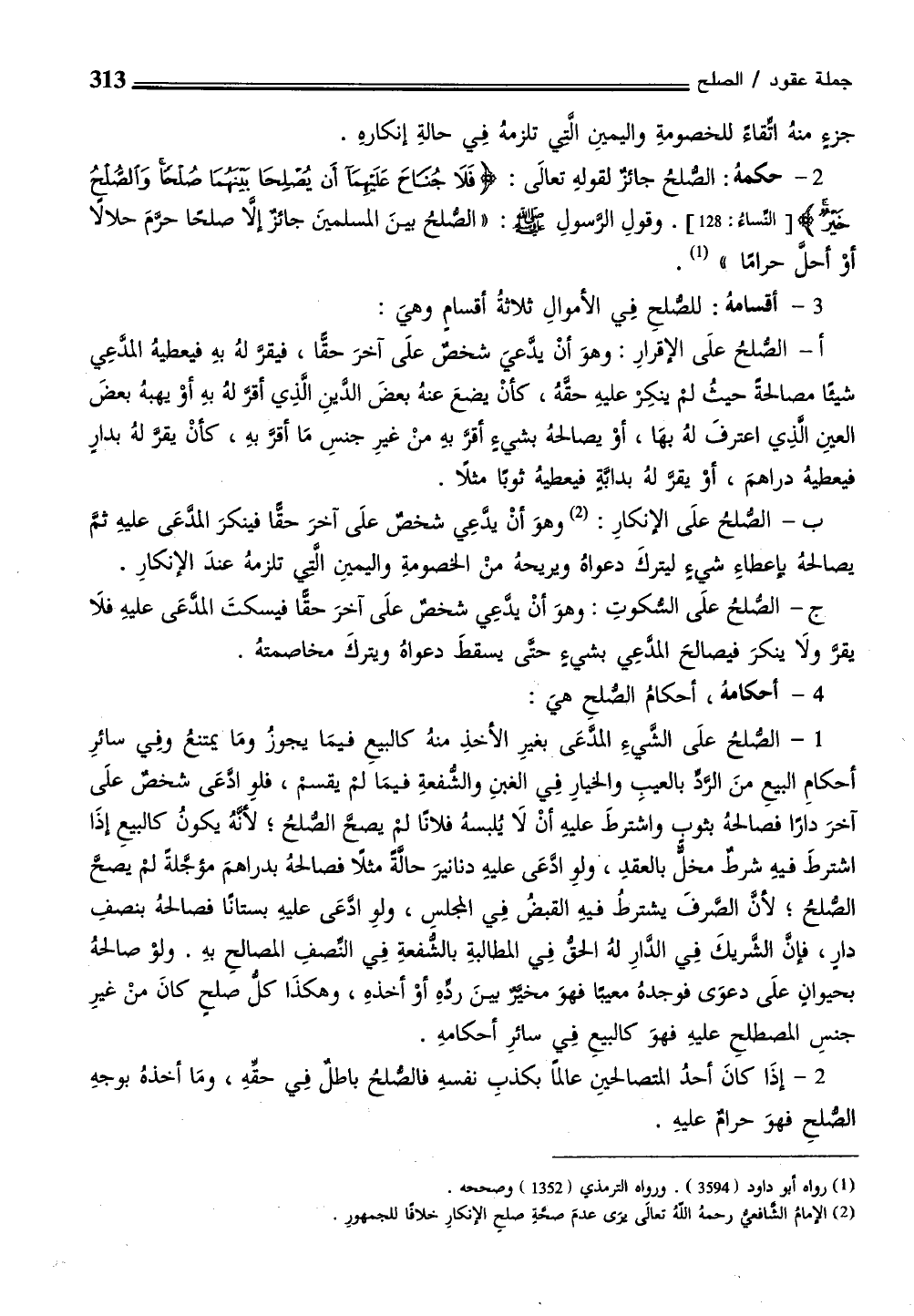 2 - حكمهُ: الصُّلحُ جائزٌ لقولهِ تعالَى: {فَلَا جُنَاحَ عَلَيْهِمَا أَنْ يُصْلِحَا بَيْنَهُمَا صُلْحًا وَالصُّلْحُ خَيْرٌ} [النساء:128]. وقولِ الرسولِ - صلى الله عليه وسلم -: "الصُّلحُ بينَ المسلمينَ جائز إلاَّ صلحًا حرم حلالًا أوْ أحل حرامًا" (¬1).